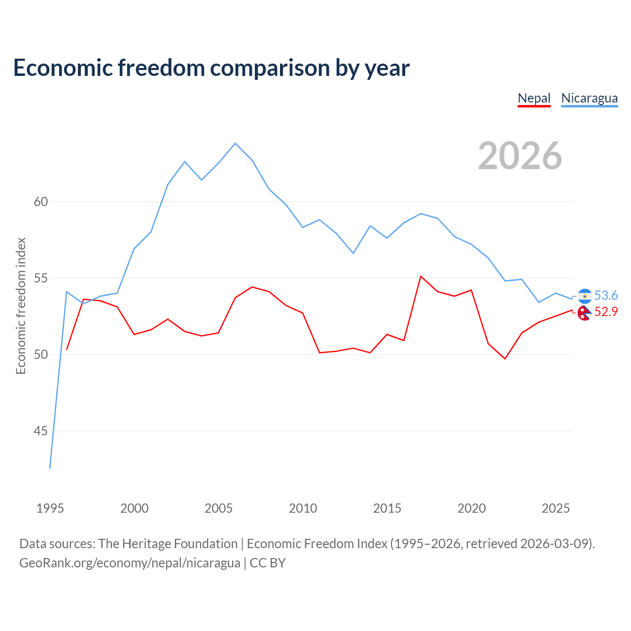 The Economic Freedom Index for Nepal is 52.9, ranking 144/197, compared to 53.6 for Nicaragua, ranking 139/197. The chart above displays a comparison of annual changes in economic freedom indexes.