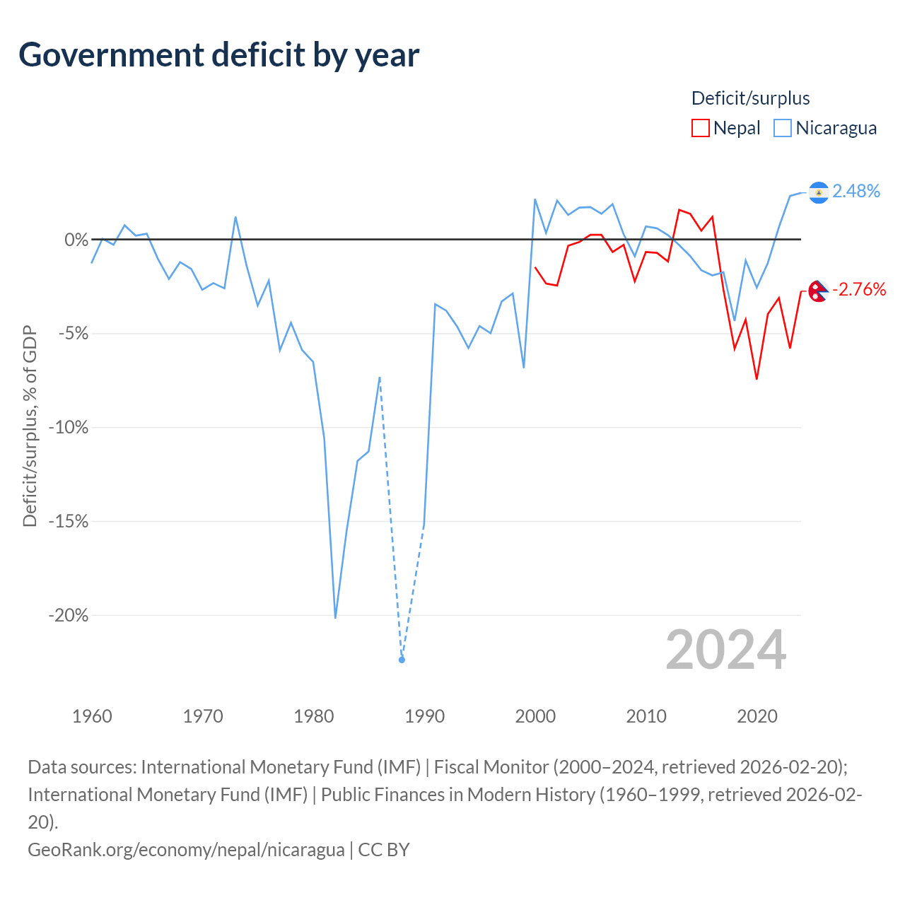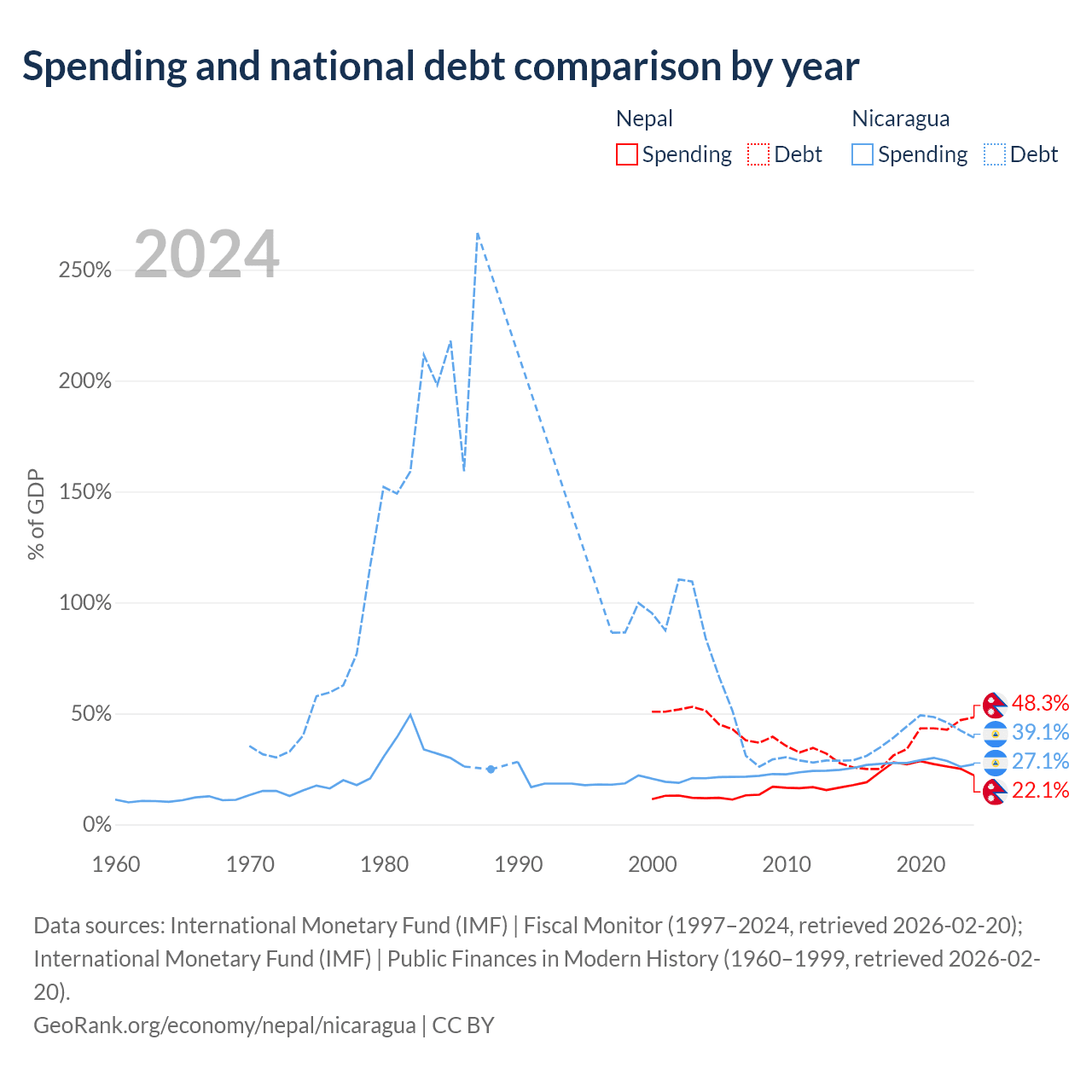 Nepal has $20.7B in government debt (48.3% of GDP), compared to $7.71B (39.1% of GDP) in Nicaragua.