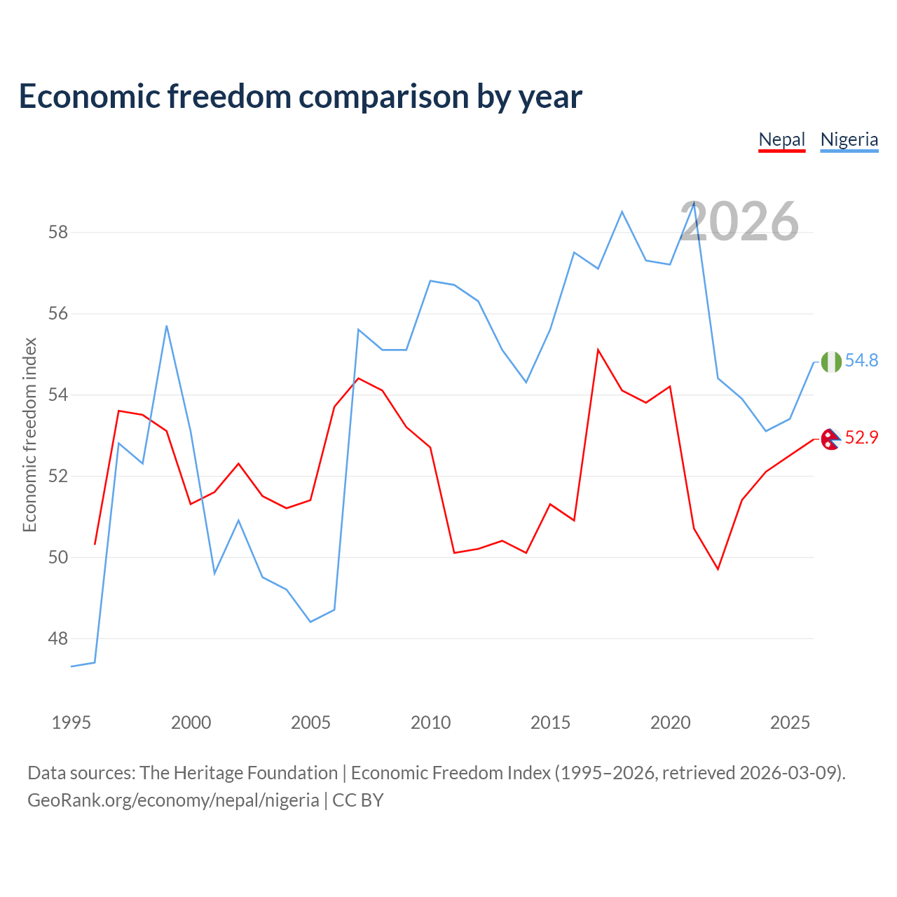 The Economic Freedom Index for Nepal is 52.9, ranking 144/197, compared to 54.8 for Nigeria, ranking 132/197. The chart above displays a comparison of annual changes in economic freedom indexes.