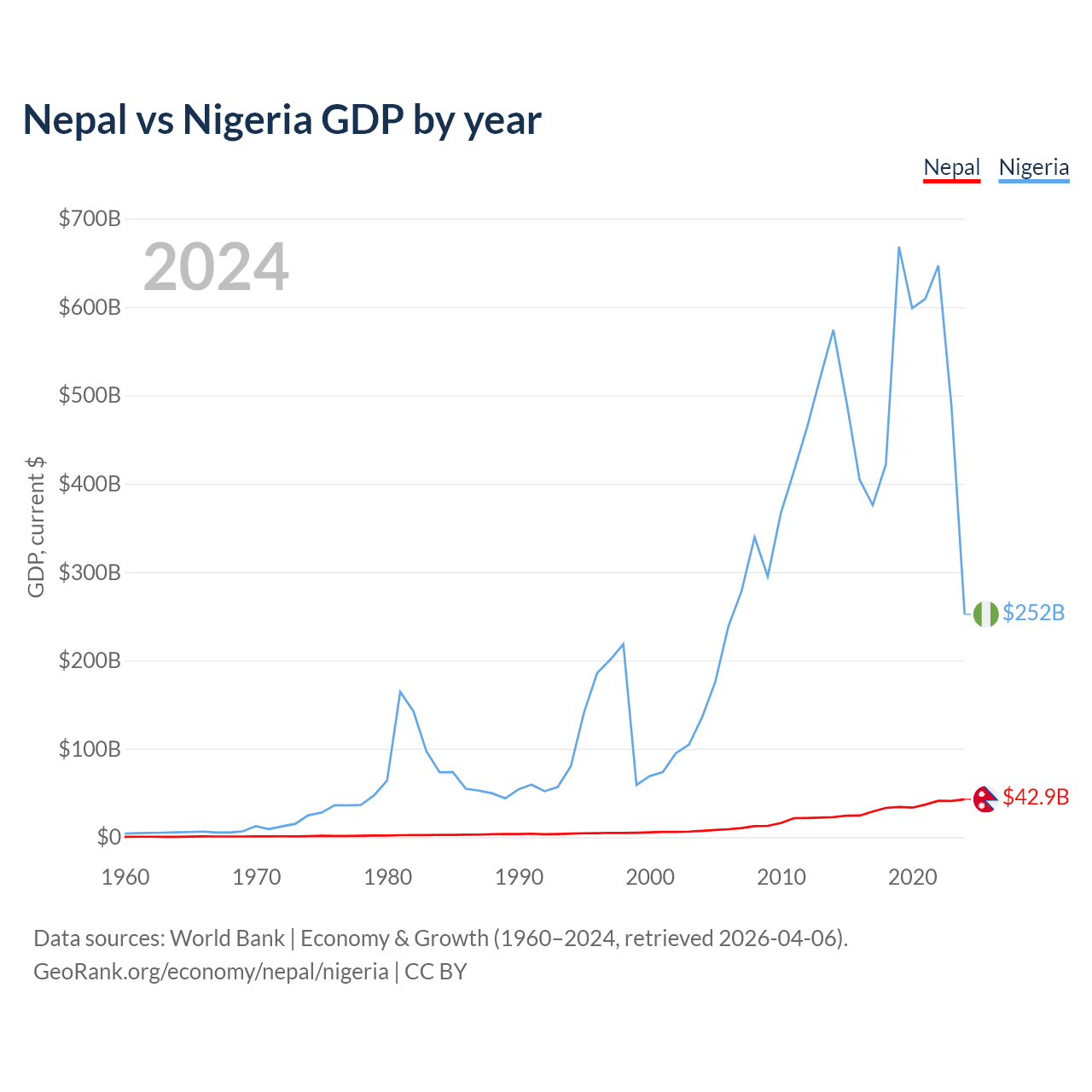 Nepal has a GDP of $42.9B compared to $252B for Nigeria, ranking 101/197 and 54/197 by economy size, respectively.