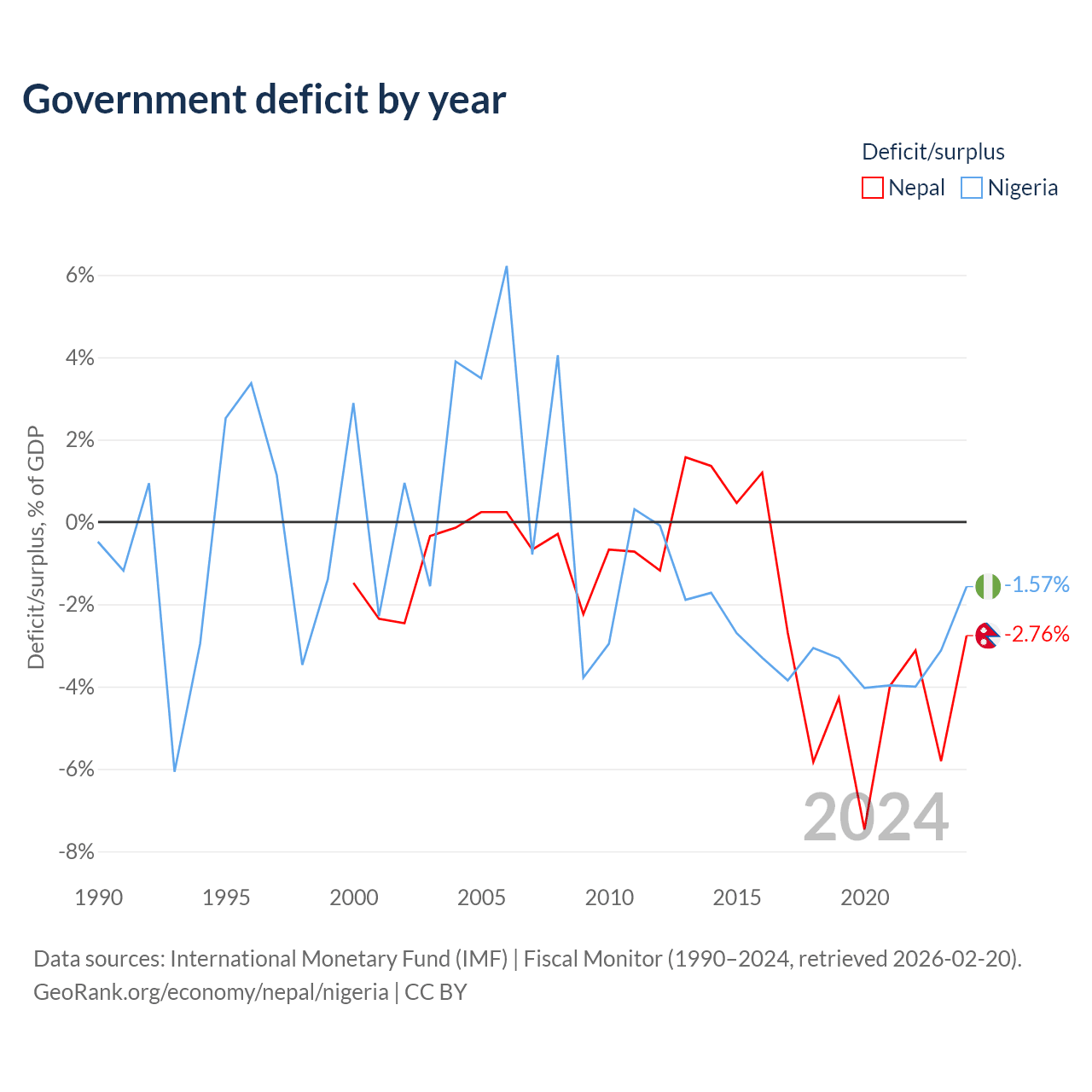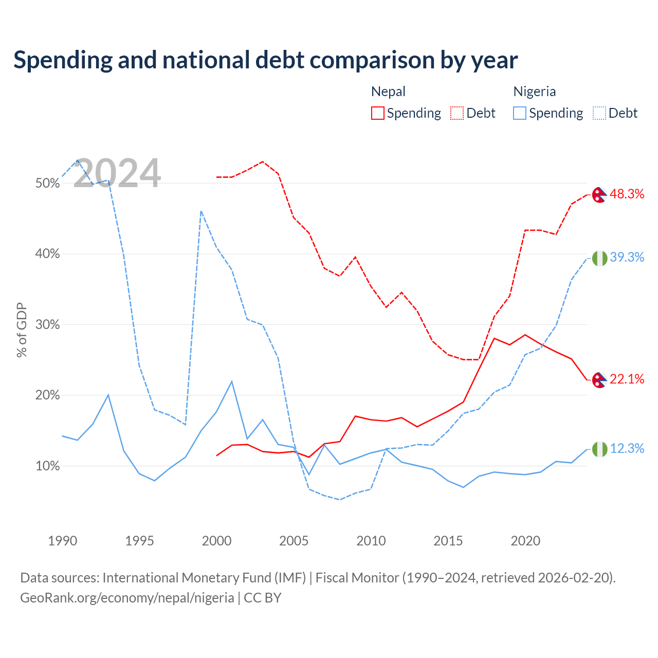Nepal has $20.7B in government debt (48.3% of GDP), compared to $99.2B (39.3% of GDP) in Nigeria.