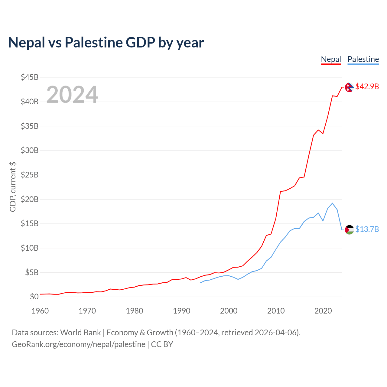 Nepal vs Palestine GDP by year