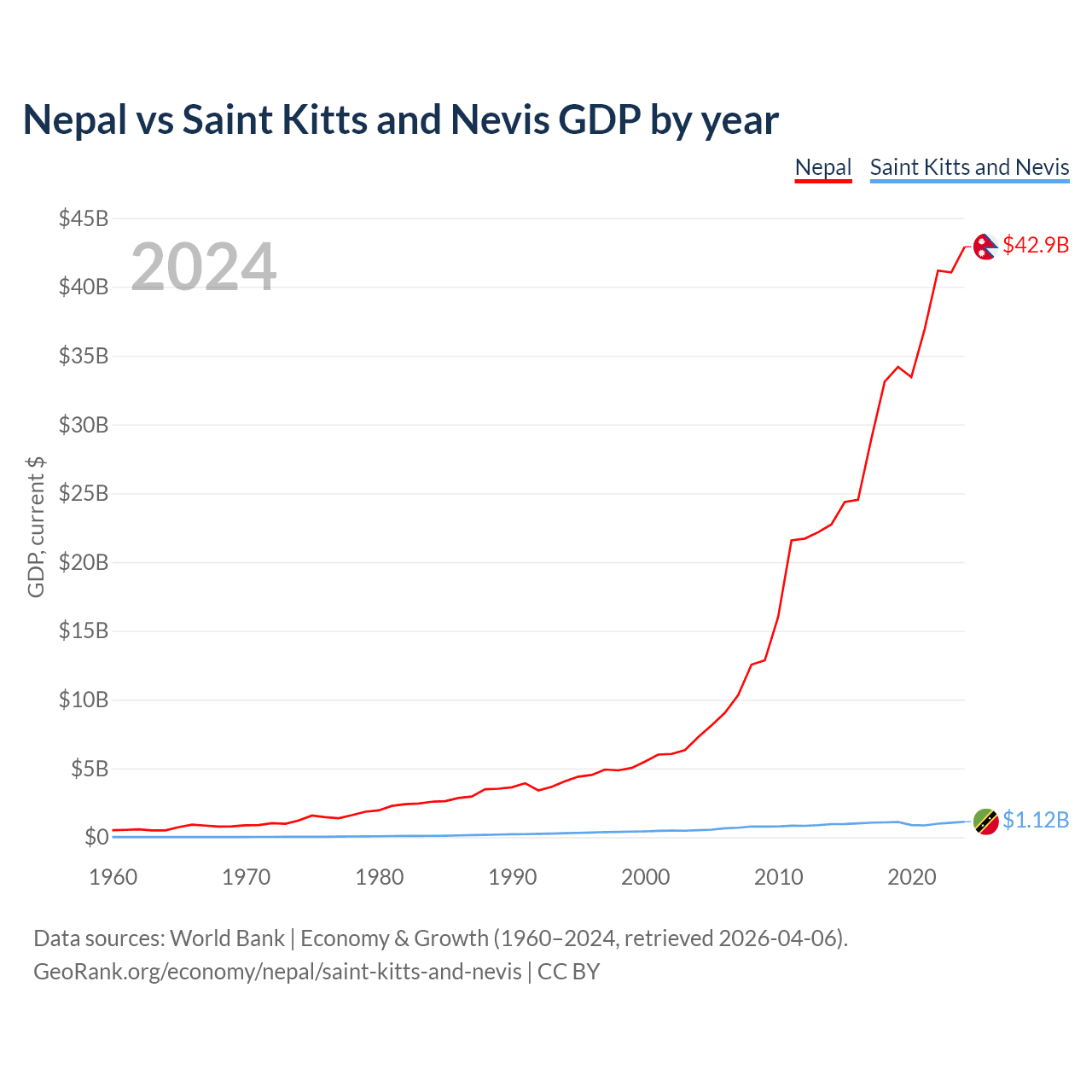 Nepal has a GDP of $42.9B compared to $1.12B for Saint Kitts and Nevis, ranking 101/197 and 187/197 by economy size, respectively.