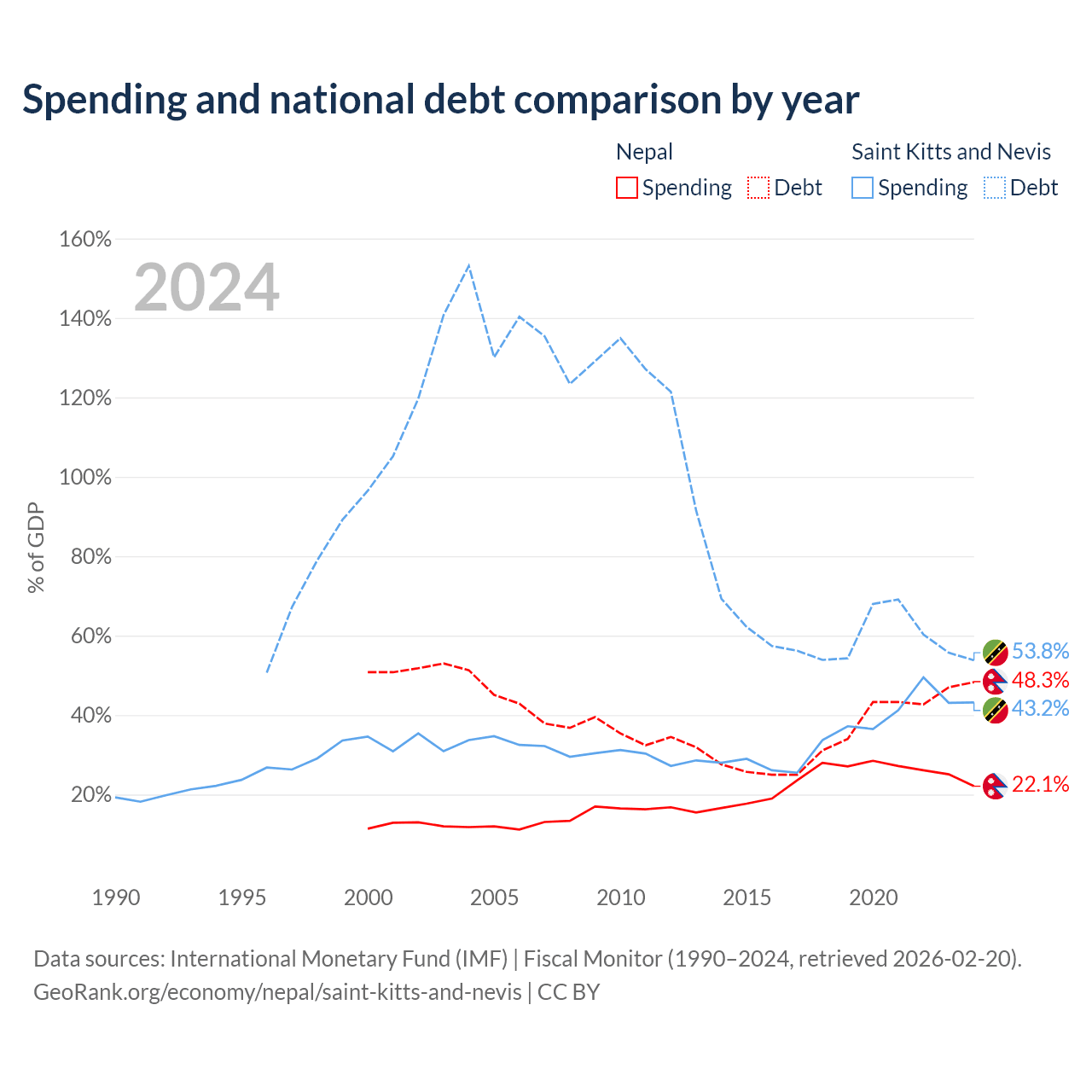 Nepal has $20.7B in government debt (48.3% of GDP), compared to $604M (53.8% of GDP) in Saint Kitts and Nevis.