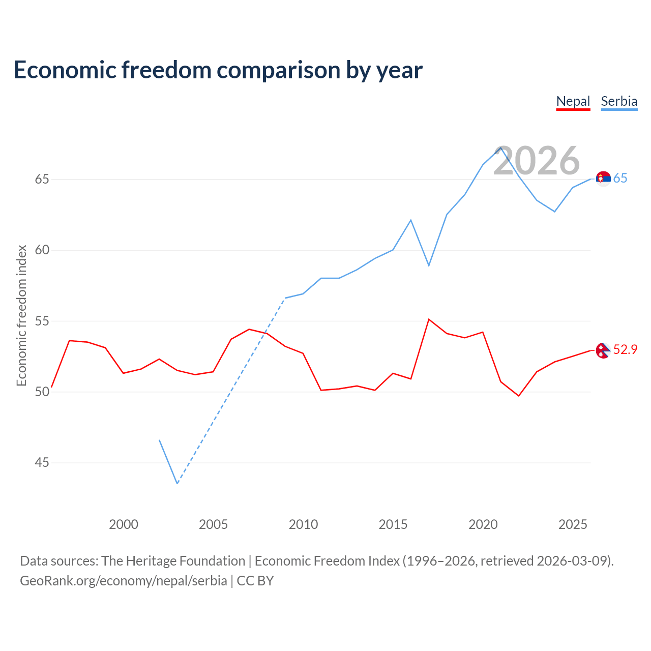 The Economic Freedom Index for Nepal is 52.9, ranking 144/197, compared to 65 for Serbia, ranking 68/197. The chart above displays a comparison of annual changes in economic freedom indexes.