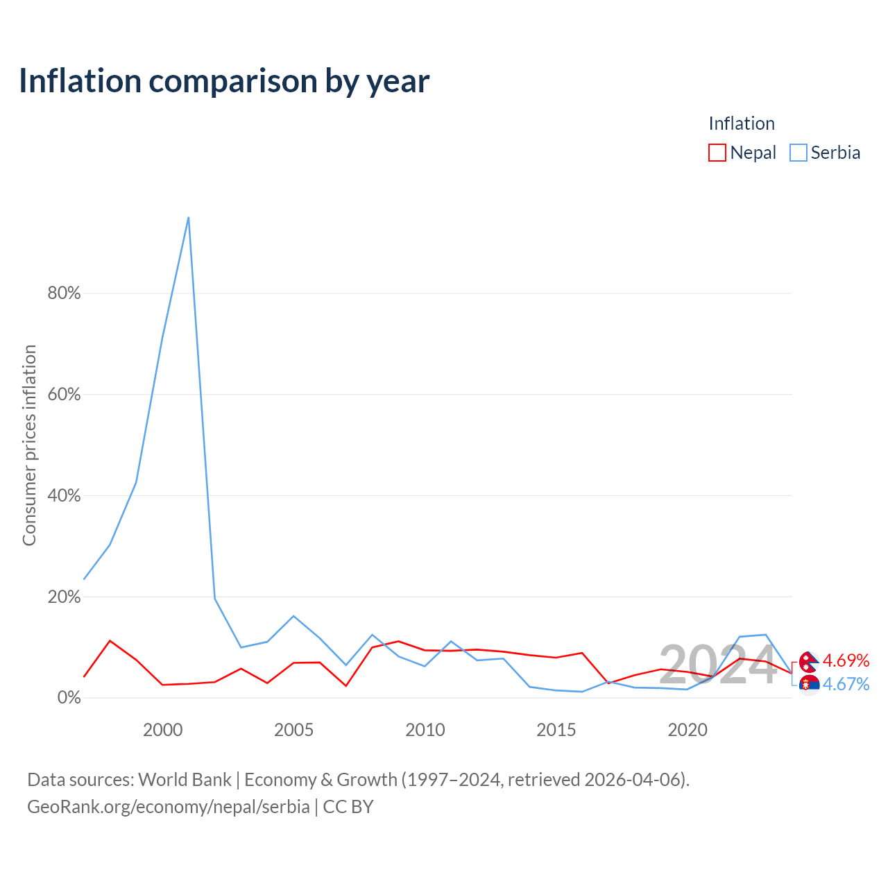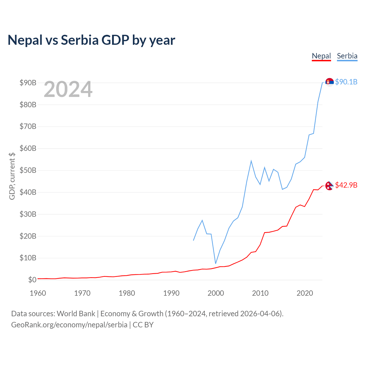 Nepal has a GDP of $42.9B compared to $90.1B for Serbia, ranking 101/197 and 76/197 by economy size, respectively.