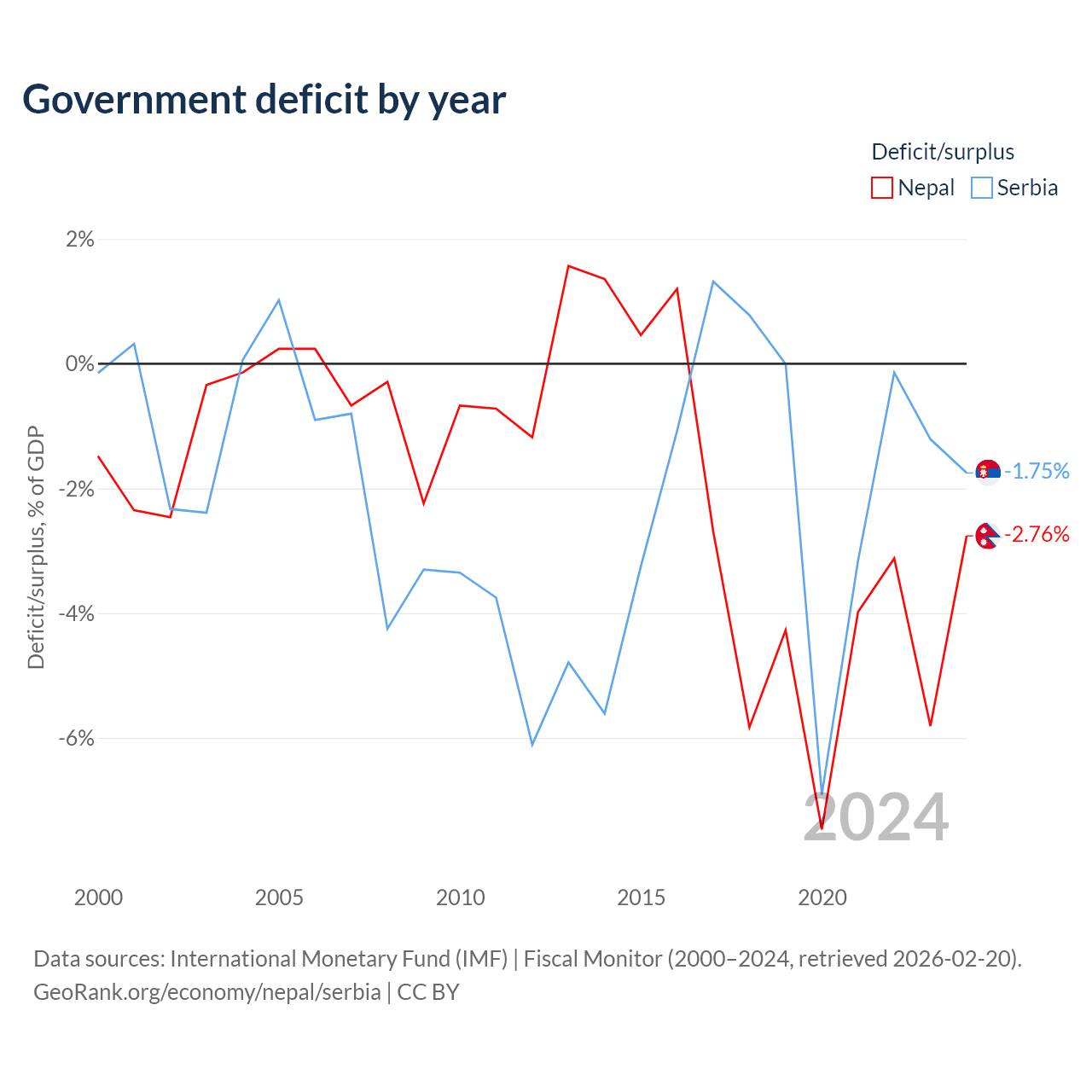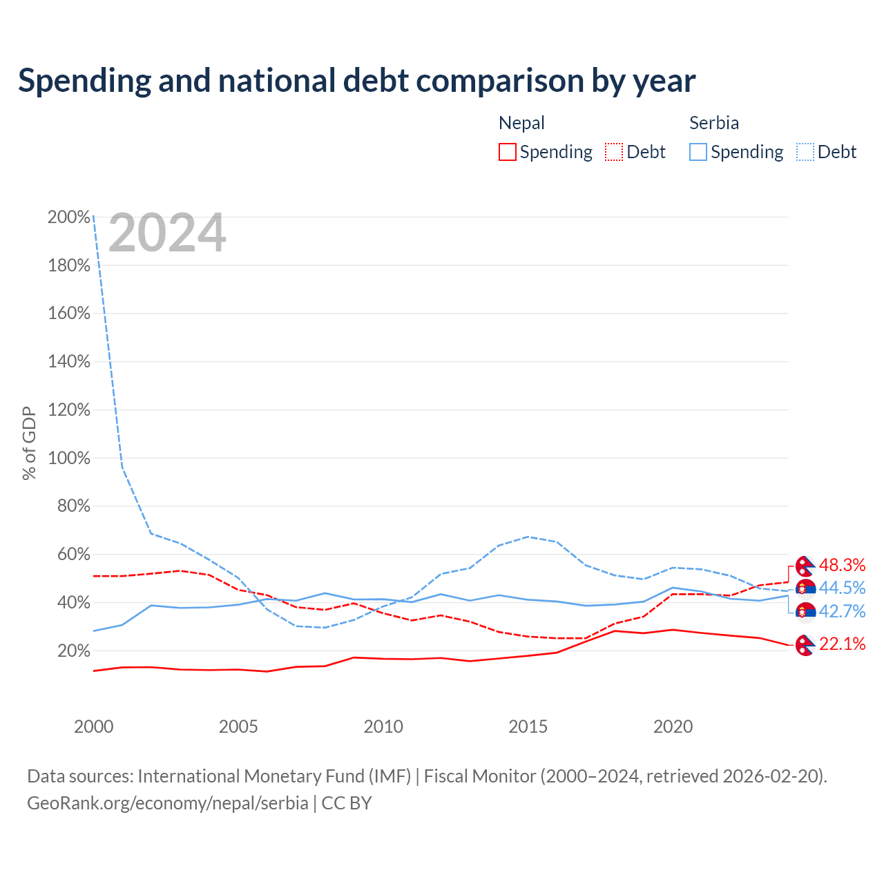Nepal has $20.7B in government debt (48.3% of GDP), compared to $40.1B (44.5% of GDP) in Serbia.