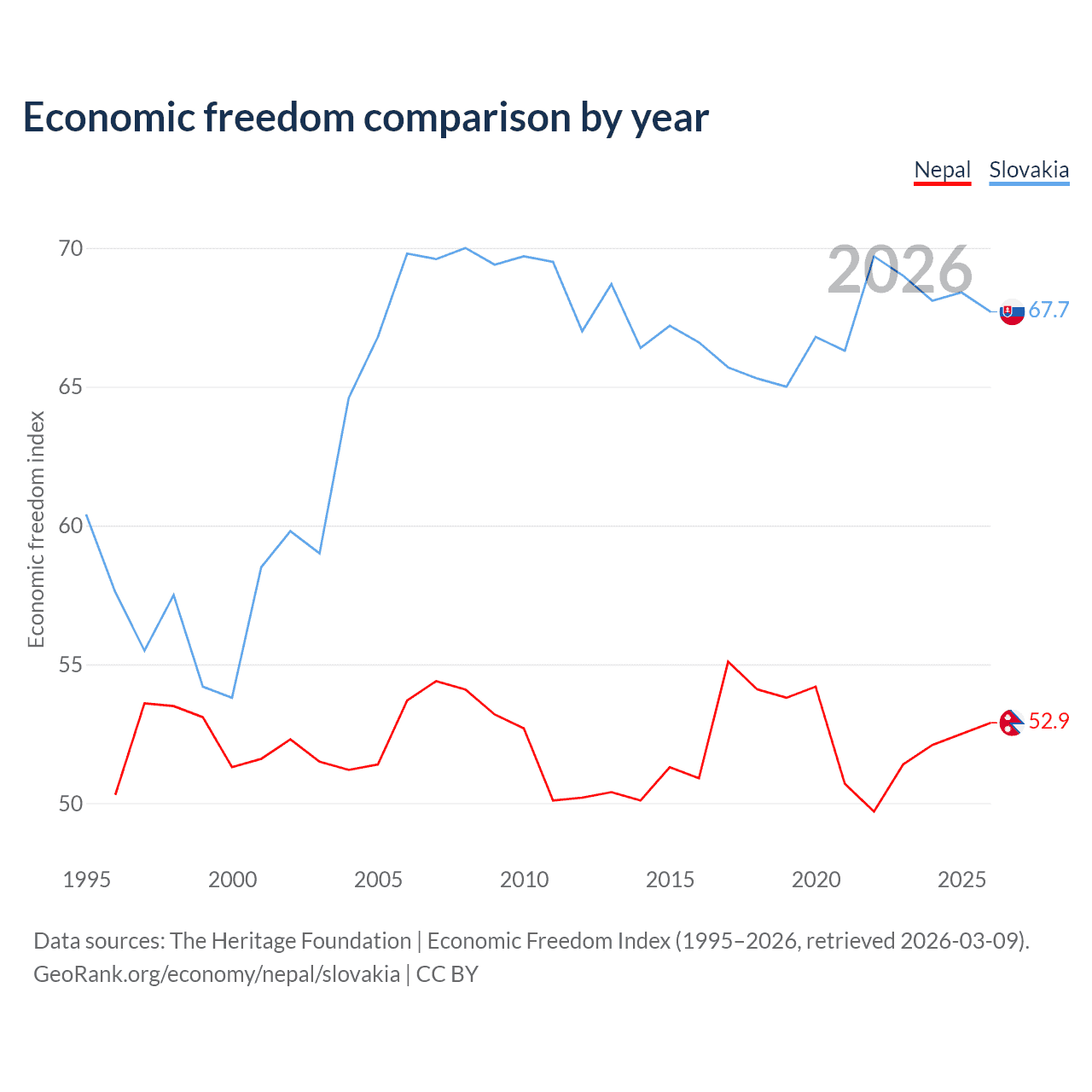 The Economic Freedom Index for Nepal is 52.9, ranking 144/197, compared to 67.7 for Slovakia, ranking 54/197. The chart above displays a comparison of annual changes in economic freedom indexes.