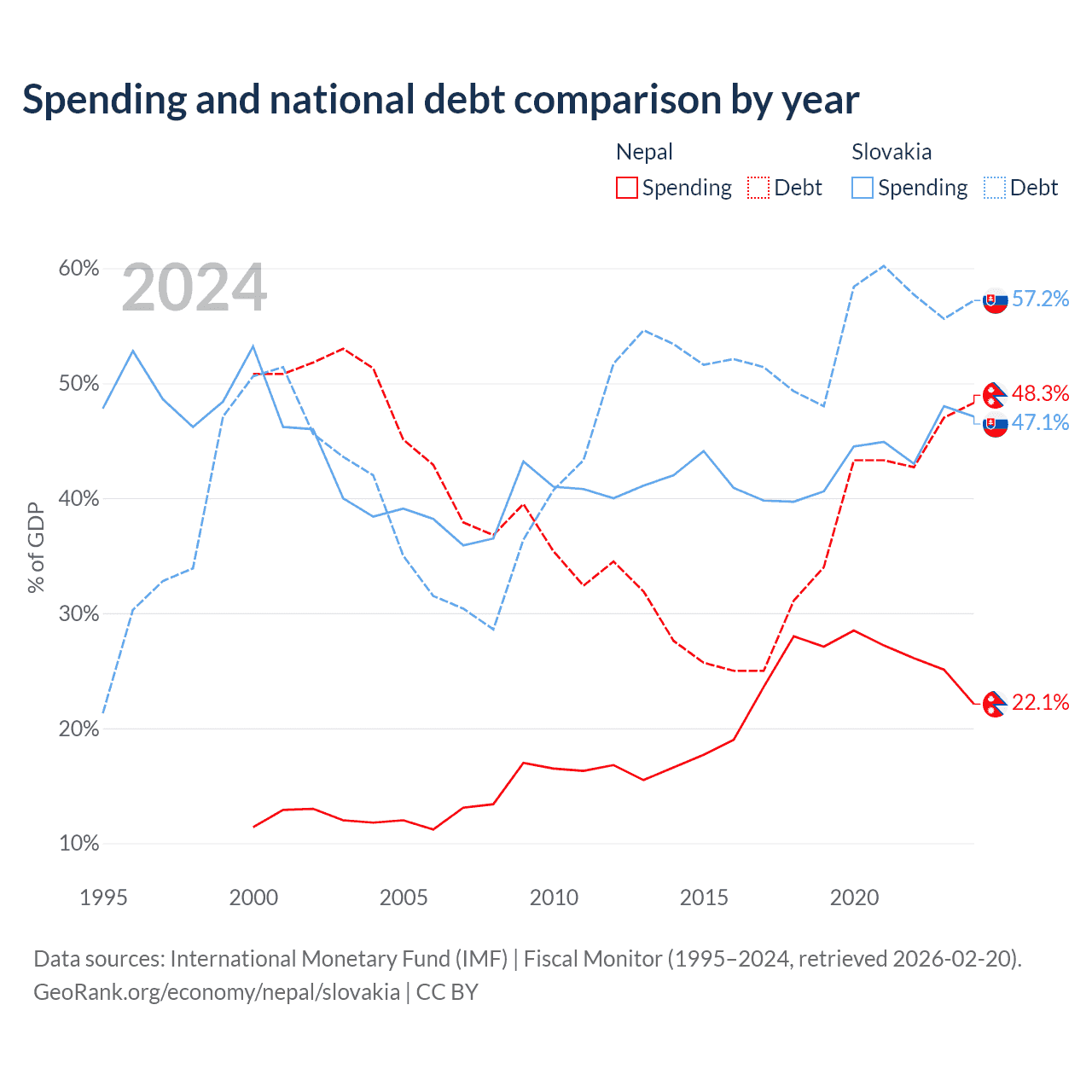 Nepal has $20.7B in government debt (48.3% of GDP), compared to $80.7B (57.2% of GDP) in Slovakia.