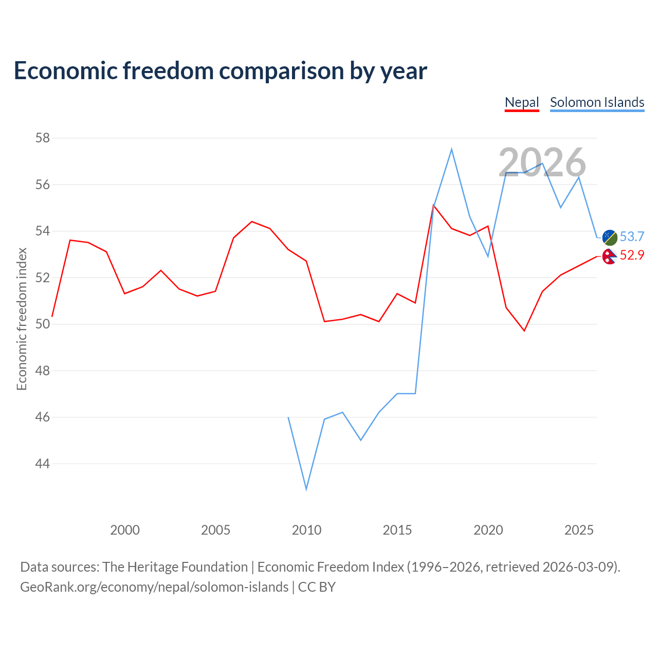 The Economic Freedom Index for Nepal is 52.9, ranking 144/197, compared to 53.7 for the Solomon Islands, ranking 137/197. The chart above displays a comparison of annual changes in economic freedom indexes.