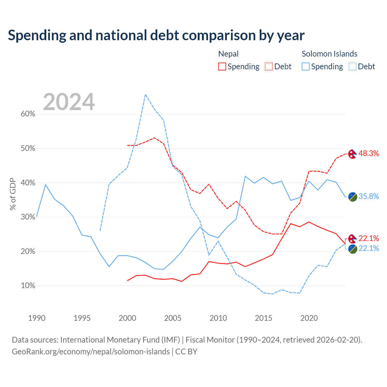 Nepal has $20.7B in government debt (48.3% of GDP), compared to $350M (22.1% of GDP) in the Solomon Islands.