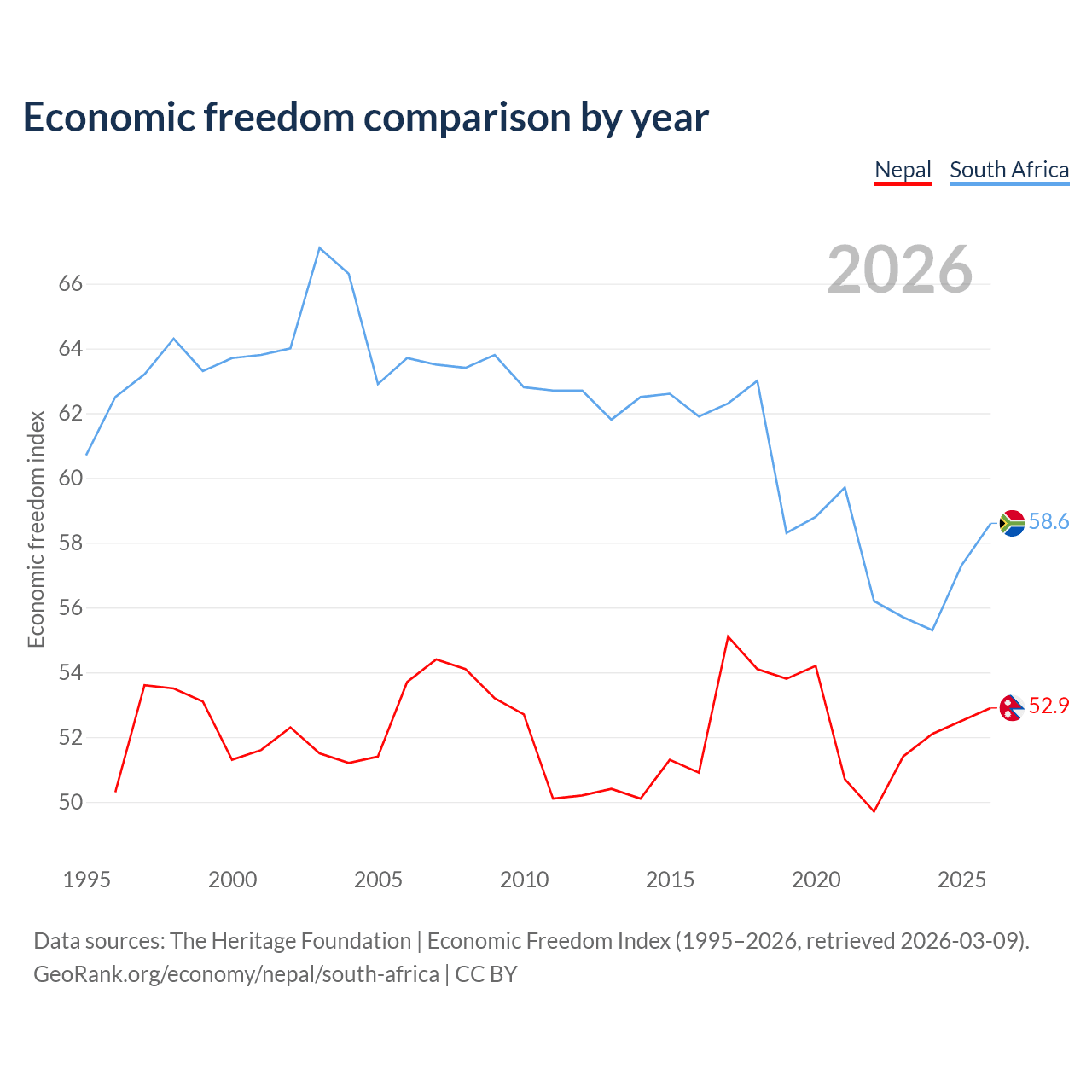 The Economic Freedom Index for Nepal is 52.9, ranking 144/197, compared to 58.6 for South Africa, ranking 110/197. The chart above displays a comparison of annual changes in economic freedom indexes.