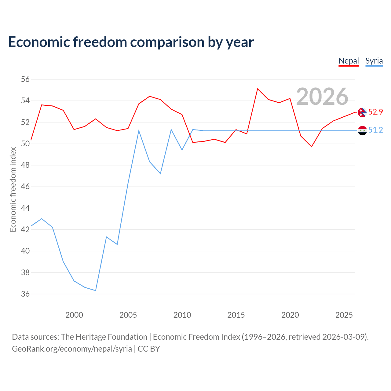 The Economic Freedom Index for Nepal is 52.9, ranking 144/197, compared to 51.2 for Syria, ranking 155/197. The chart above displays a comparison of annual changes in economic freedom indexes.
