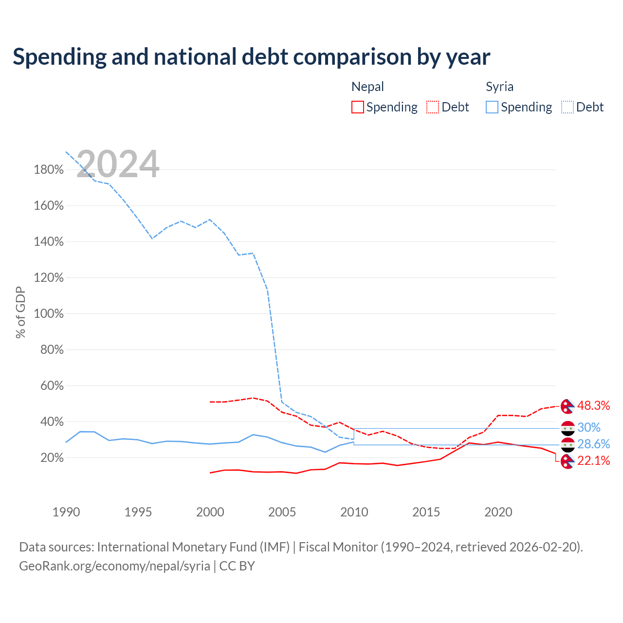 Nepal has $20.7B in government debt (48.3% of GDP), compared to $18.4B (30% of GDP) in Syria.