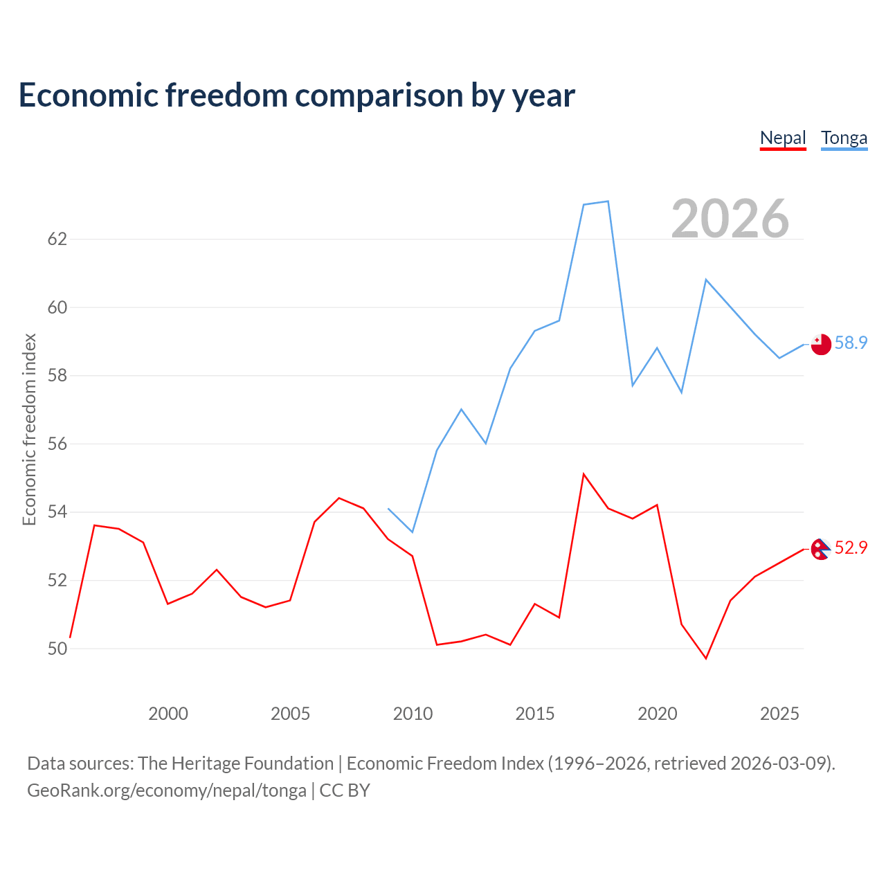 The Economic Freedom Index for Nepal is 52.9, ranking 144/197, compared to 58.9 for Tonga, ranking 107/197. The chart above displays a comparison of annual changes in economic freedom indexes.