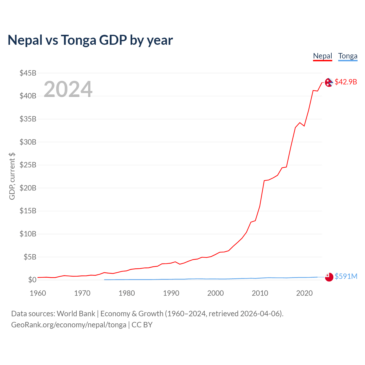 Nepal has a GDP of $42.9B compared to $591M for Tonga, ranking 101/197 and 191/197 by economy size, respectively.