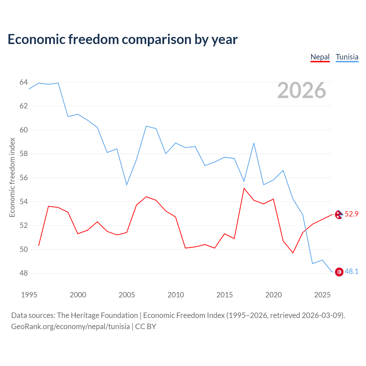The Economic Freedom Index for Nepal is 52.9, ranking 144/197, compared to 48.1 for Tunisia, ranking 172/197. The chart above displays a comparison of annual changes in economic freedom indexes.