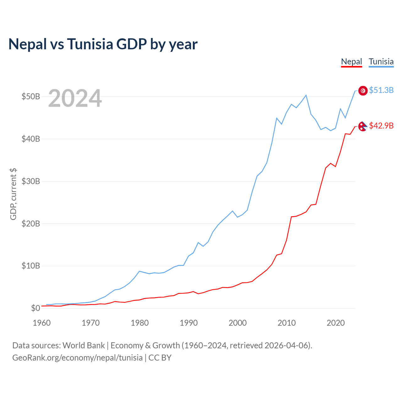 Nepal has a GDP of $42.9B compared to $51.3B for Tunisia, ranking 101/197 and 93/197 by economy size, respectively.
