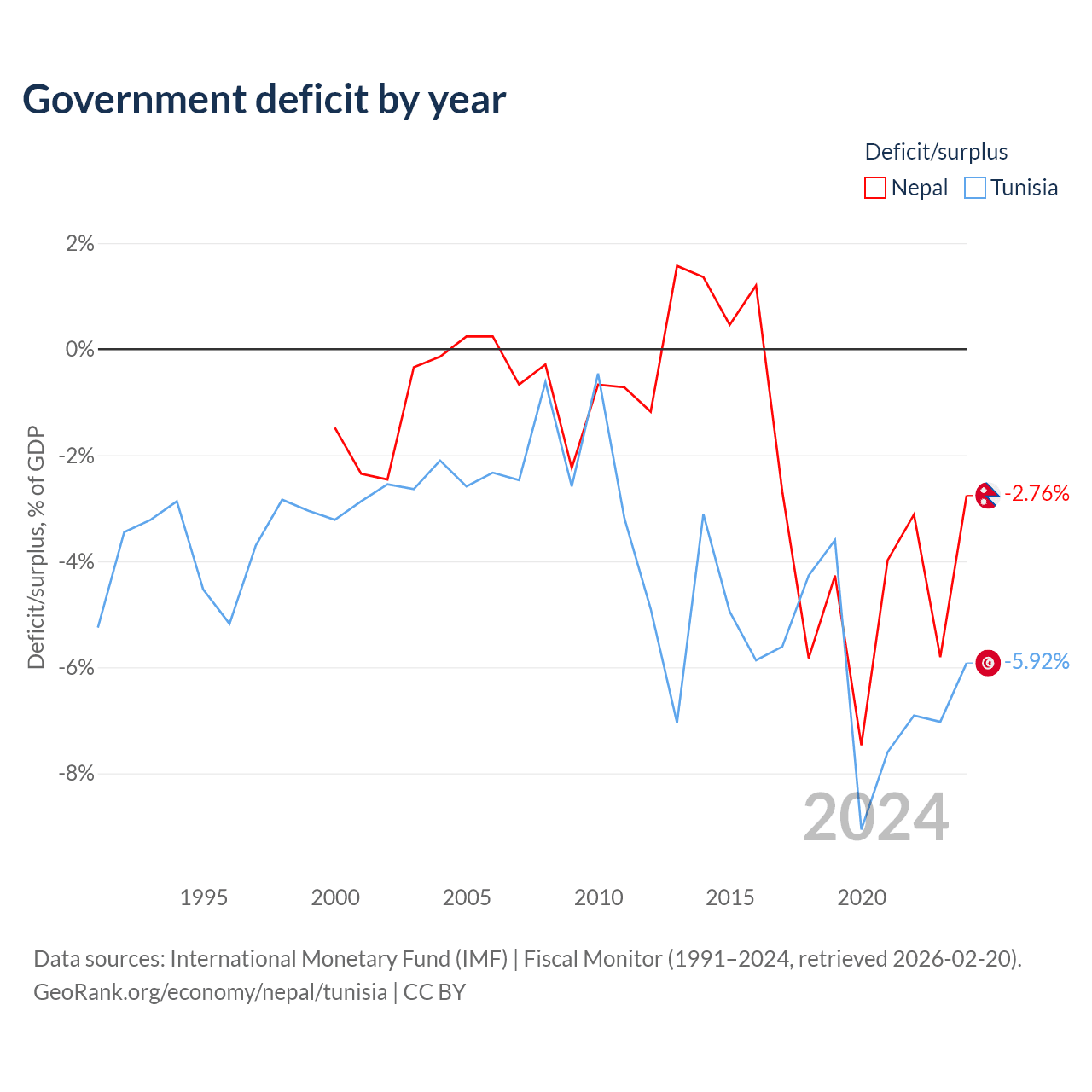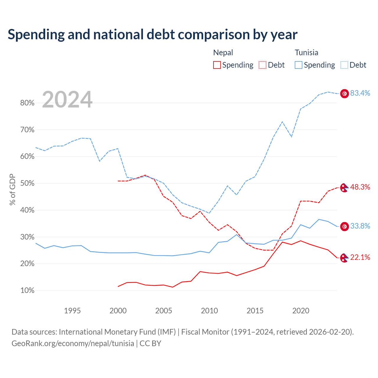 Nepal has $20.7B in government debt (48.3% of GDP), compared to $42.8B (83.4% of GDP) in Tunisia.