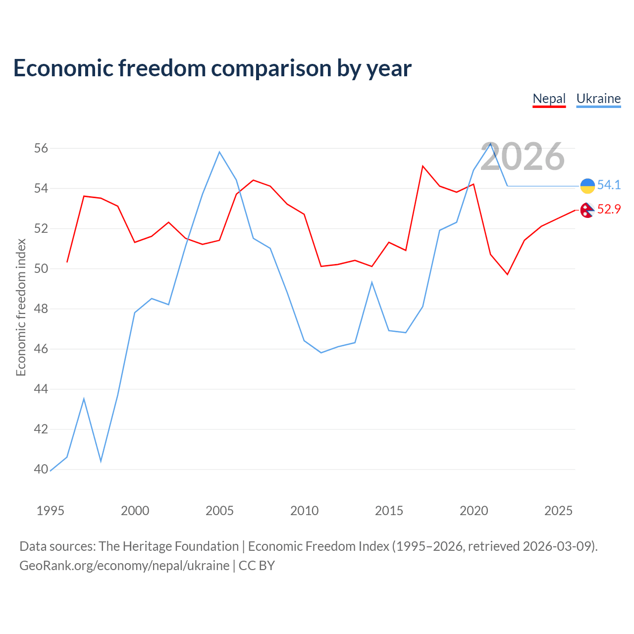 The Economic Freedom Index for Nepal is 52.9, ranking 144/197, compared to 54.1 for Ukraine, ranking 135/197. The chart above displays a comparison of annual changes in economic freedom indexes.