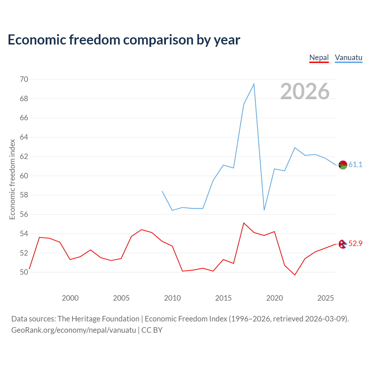 The Economic Freedom Index for Nepal is 52.9, ranking 144/197, compared to 61.1 for Vanuatu, ranking 92/197. The chart above displays a comparison of annual changes in economic freedom indexes.