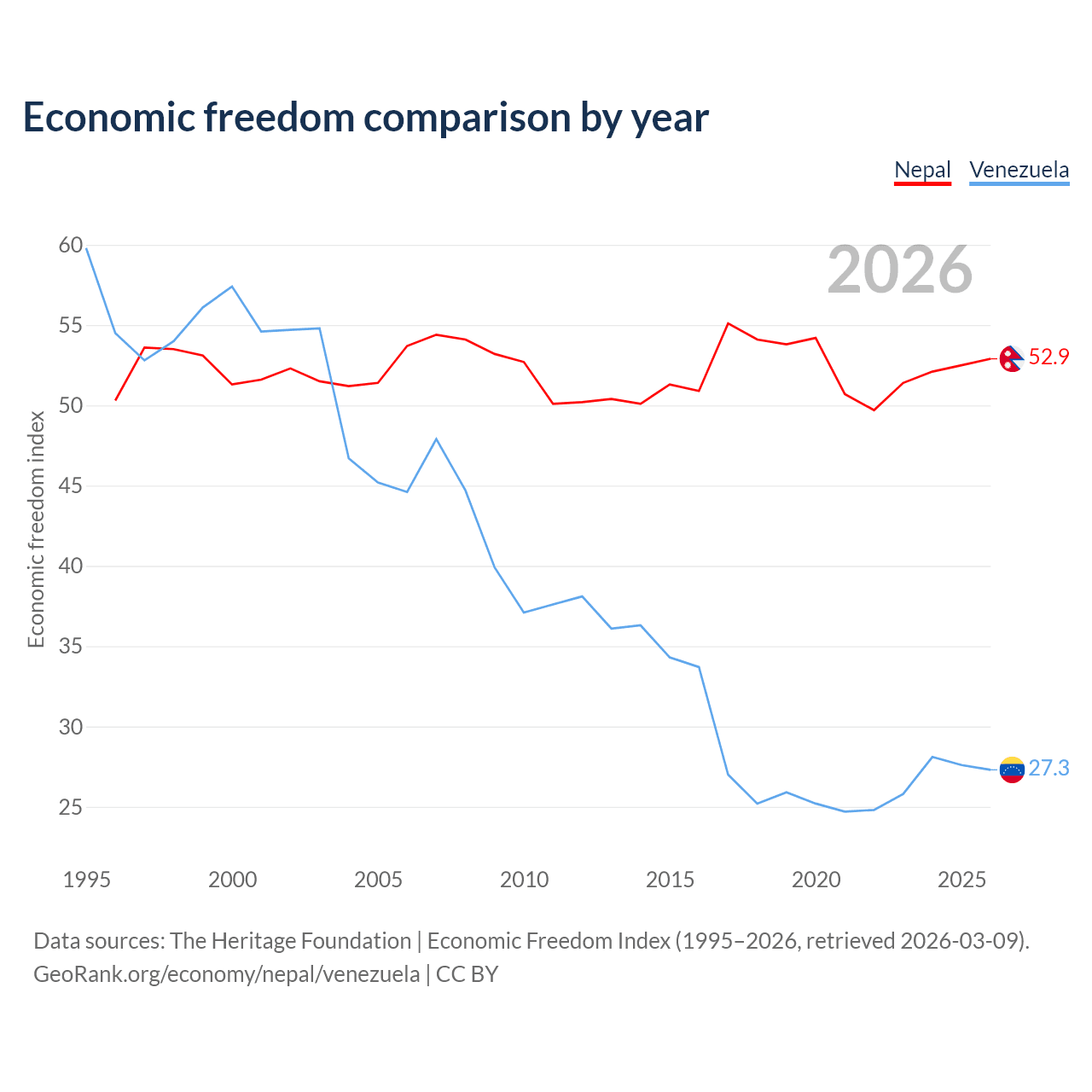 The Economic Freedom Index for Nepal is 52.9, ranking 144/197, compared to 27.3 for Venezuela, ranking 194/197. The chart above displays a comparison of annual changes in economic freedom indexes.