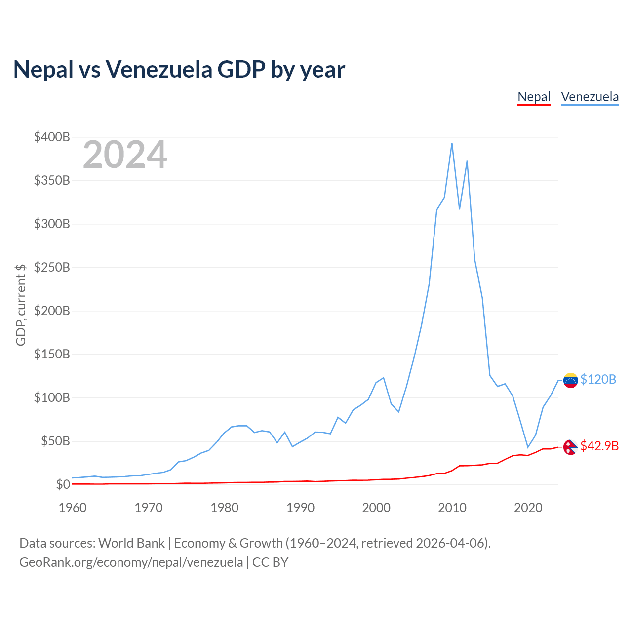Nepal has a GDP of $42.9B compared to $120B for Venezuela, ranking 101/197 and 65/197 by economy size, respectively.