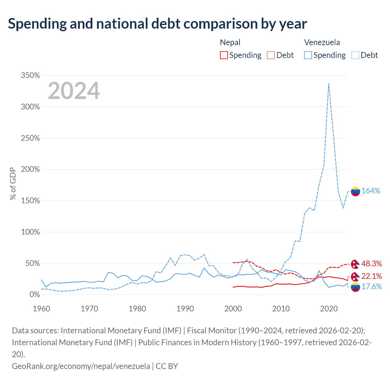 Nepal has $20.7B in government debt (48.3% of GDP), compared to $197B (164.3% of GDP) in Venezuela.
