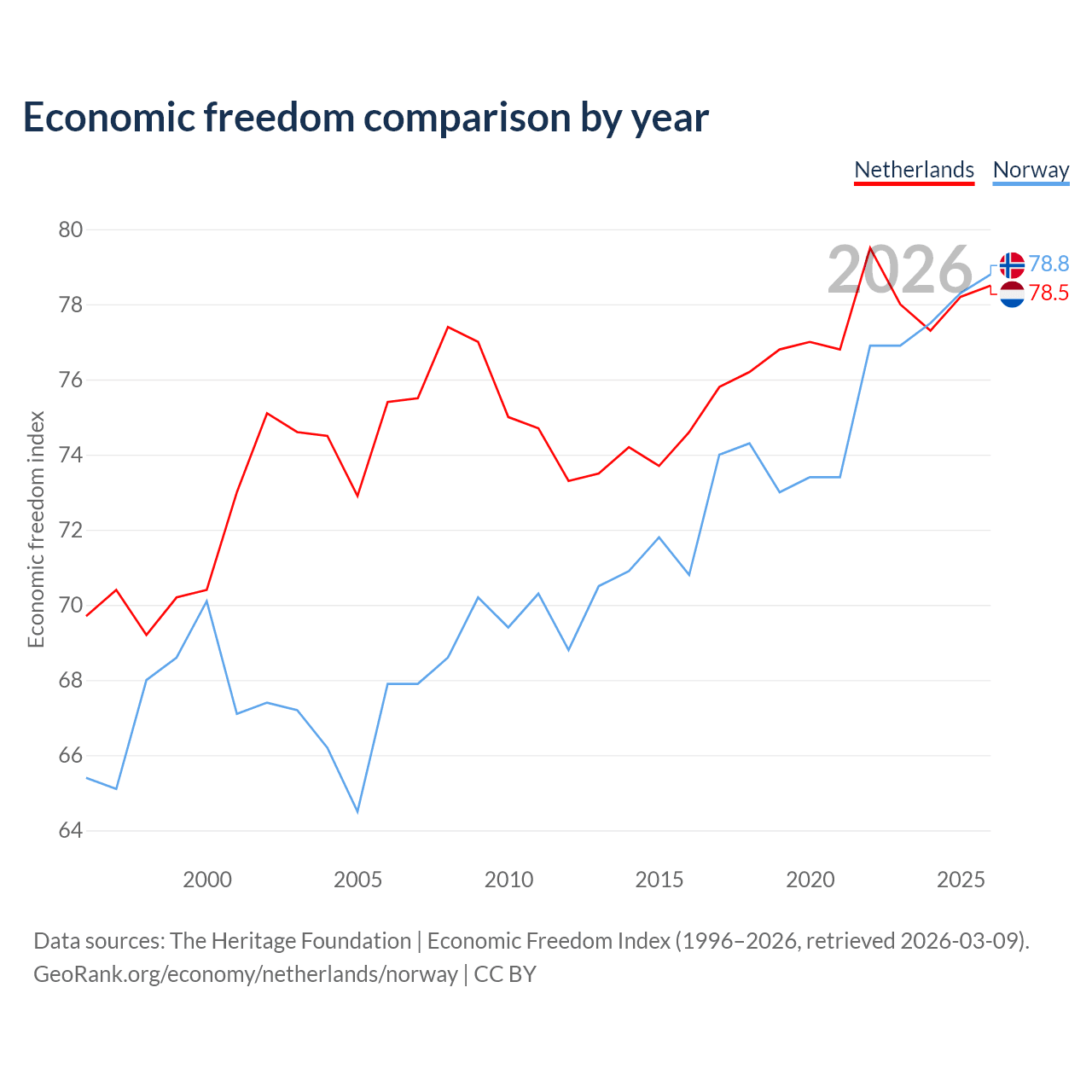 The Economic Freedom Index for the Netherlands is 78.5, ranking 11/197, compared to 78.8 for Norway, ranking 9/197. The chart above displays a comparison of annual changes in economic freedom indexes.