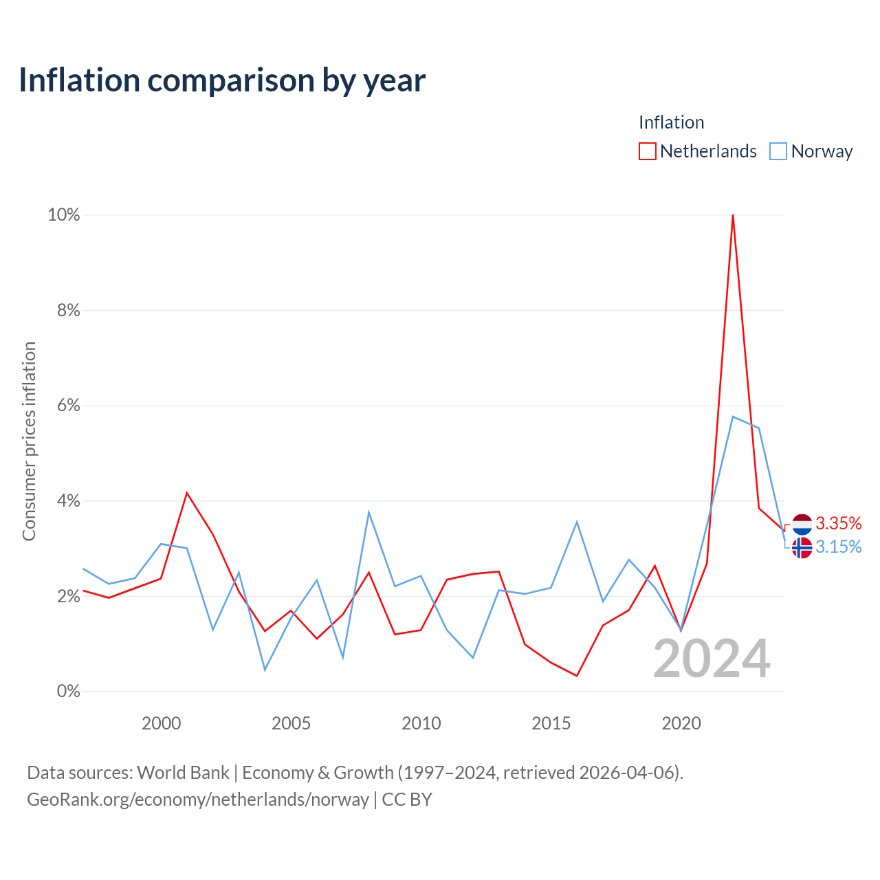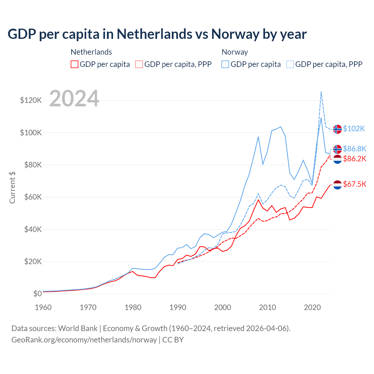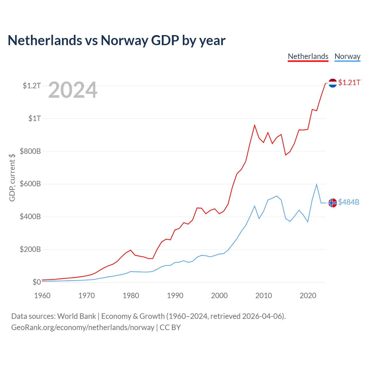 The Netherlands has a GDP of $1.21T compared to $484B for Norway, ranking 19/197 and 32/197 by economy size, respectively.