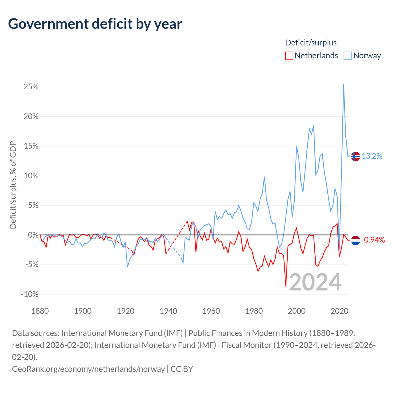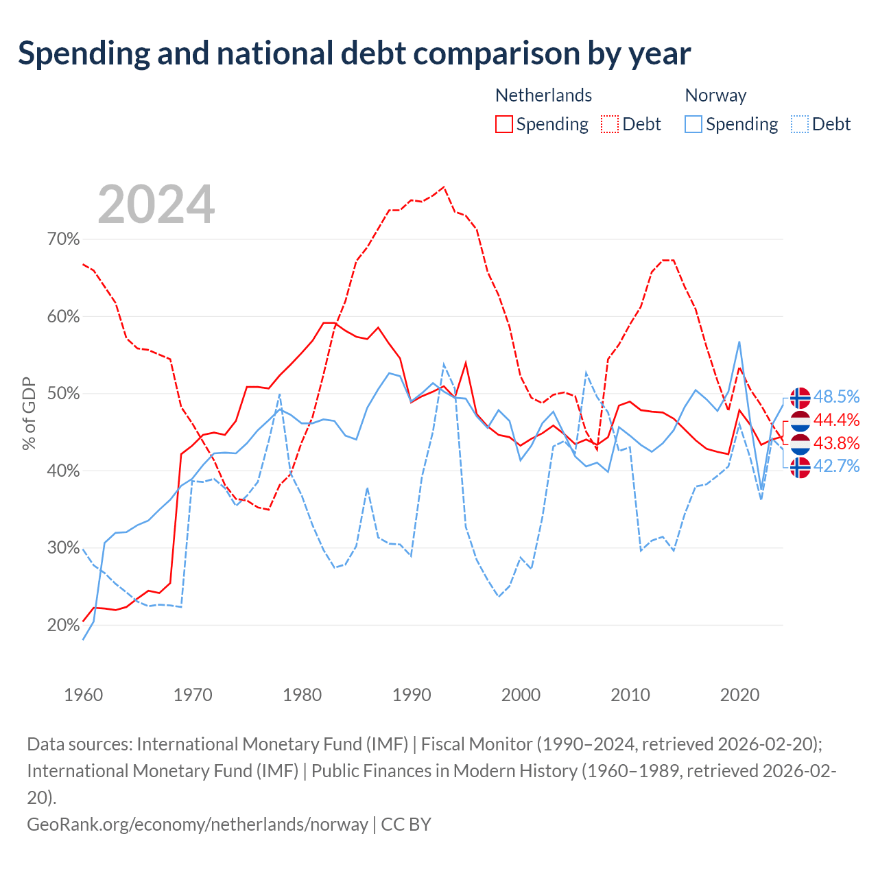 The Netherlands has $532B in government debt (43.8% of GDP), compared to $207B (42.7% of GDP) in Norway.