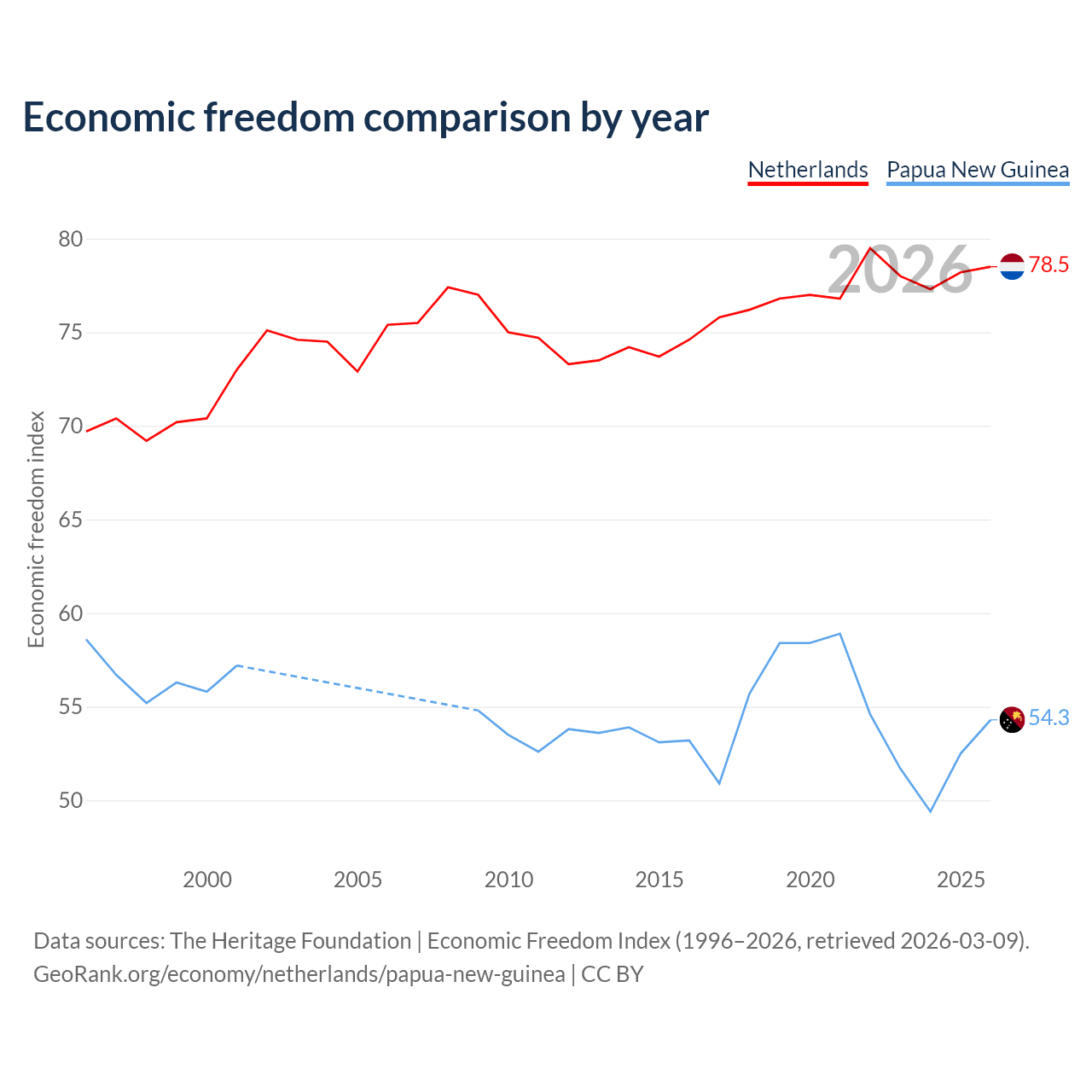 The Economic Freedom Index for the Netherlands is 78.5, ranking 11/197, compared to 54.3 for Papua New Guinea, ranking 134/197. The chart above displays a comparison of annual changes in economic freedom indexes.