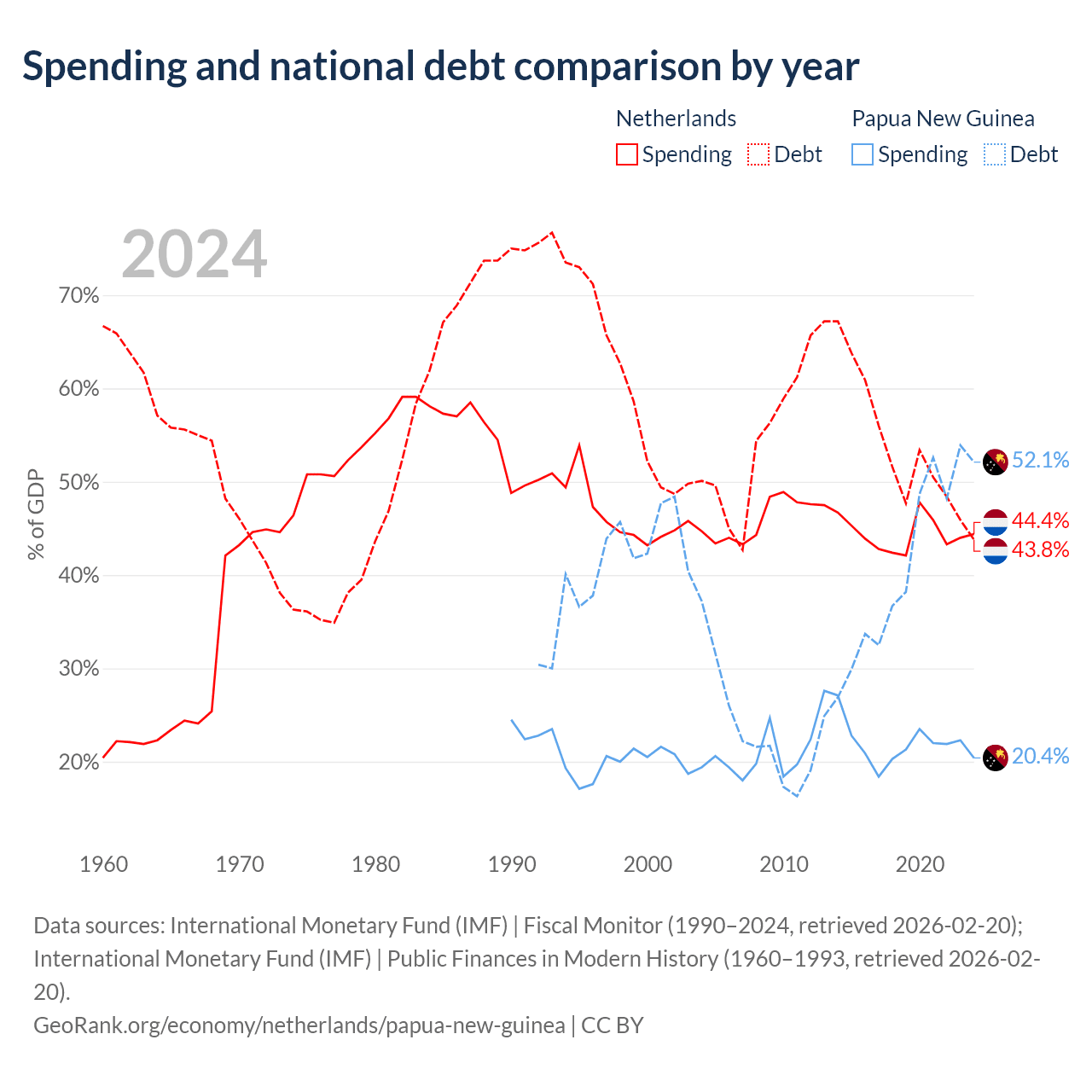The Netherlands has $532B in government debt (43.8% of GDP), compared to $16.6B (52.1% of GDP) in Papua New Guinea.