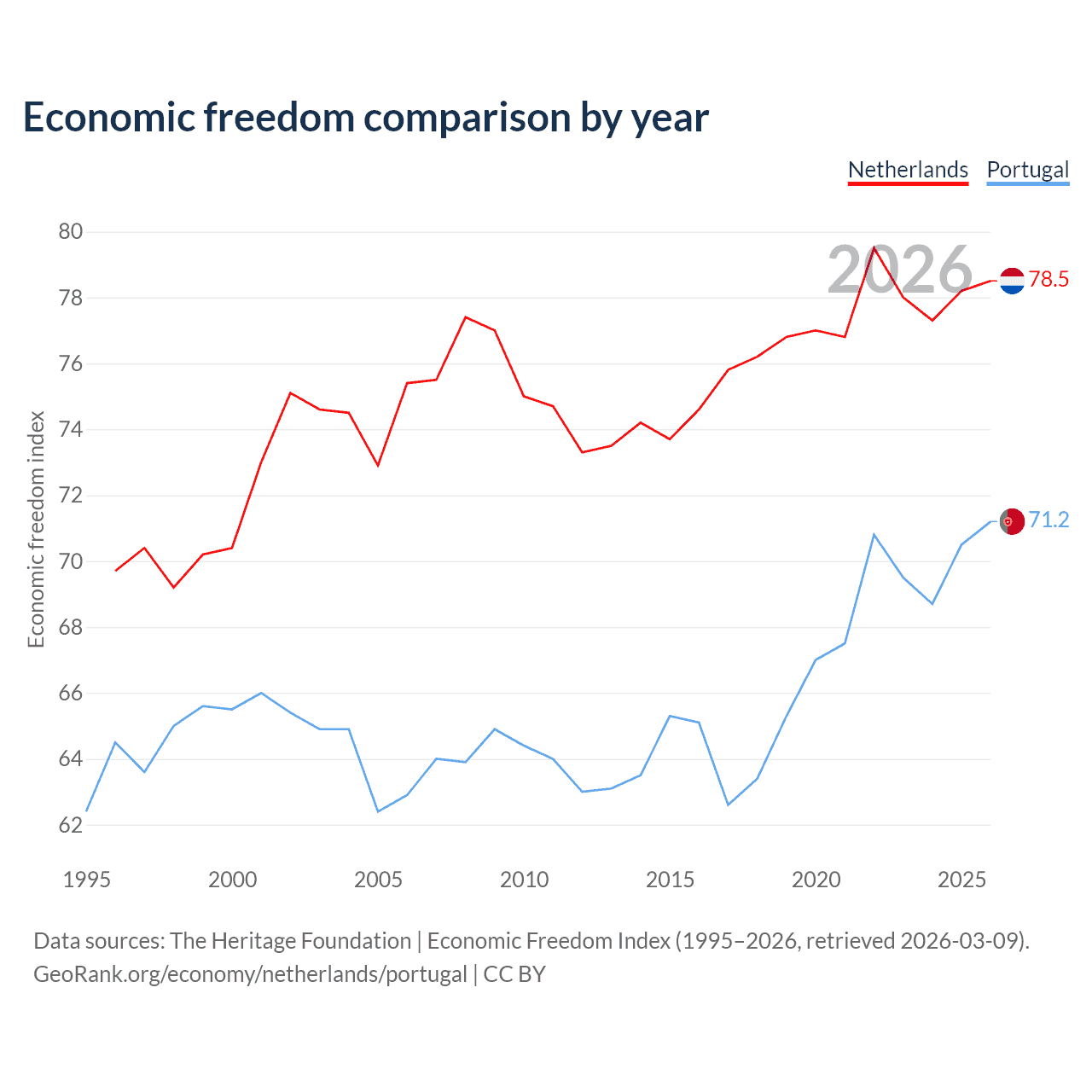 Data sources: The Heritage Foundation | Economic Freedom Index (1995–2026, retrieved 2026-03-09).