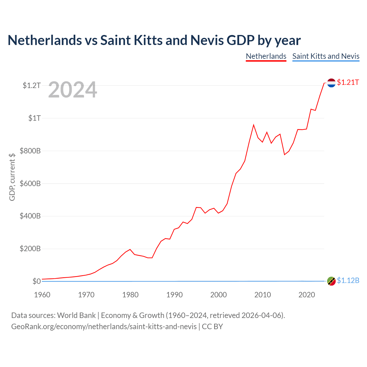 The Netherlands has a GDP of $1.21T compared to $1.12B for Saint Kitts and Nevis, ranking 19/197 and 187/197 by economy size, respectively.