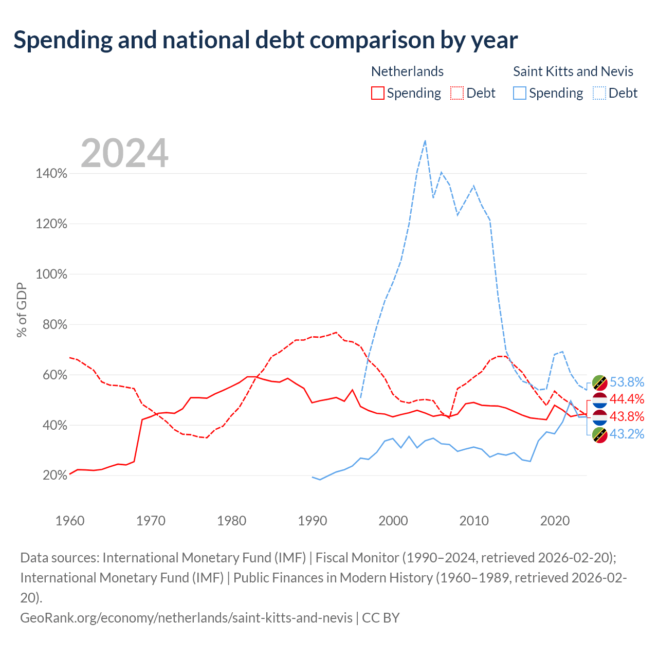 The Netherlands has $532B in government debt (43.8% of GDP), compared to $604M (53.8% of GDP) in Saint Kitts and Nevis.