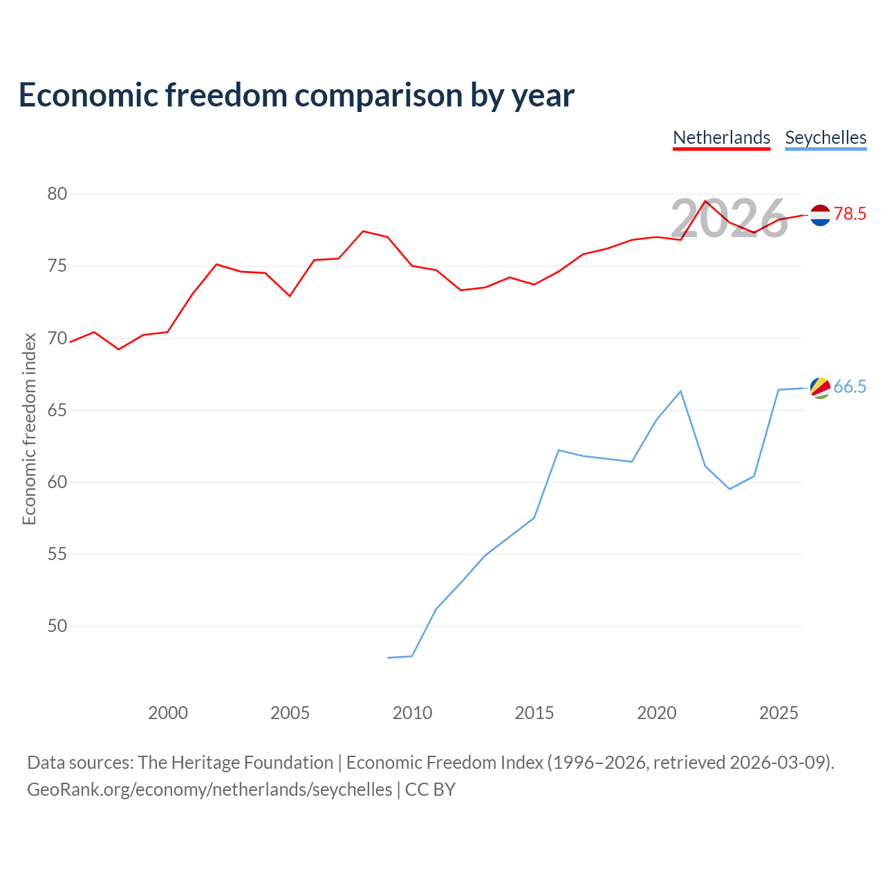 The Economic Freedom Index for the Netherlands is 78.5, ranking 11/197, compared to 66.5 for the Seychelles, ranking 60/197. The chart above displays a comparison of annual changes in economic freedom indexes.