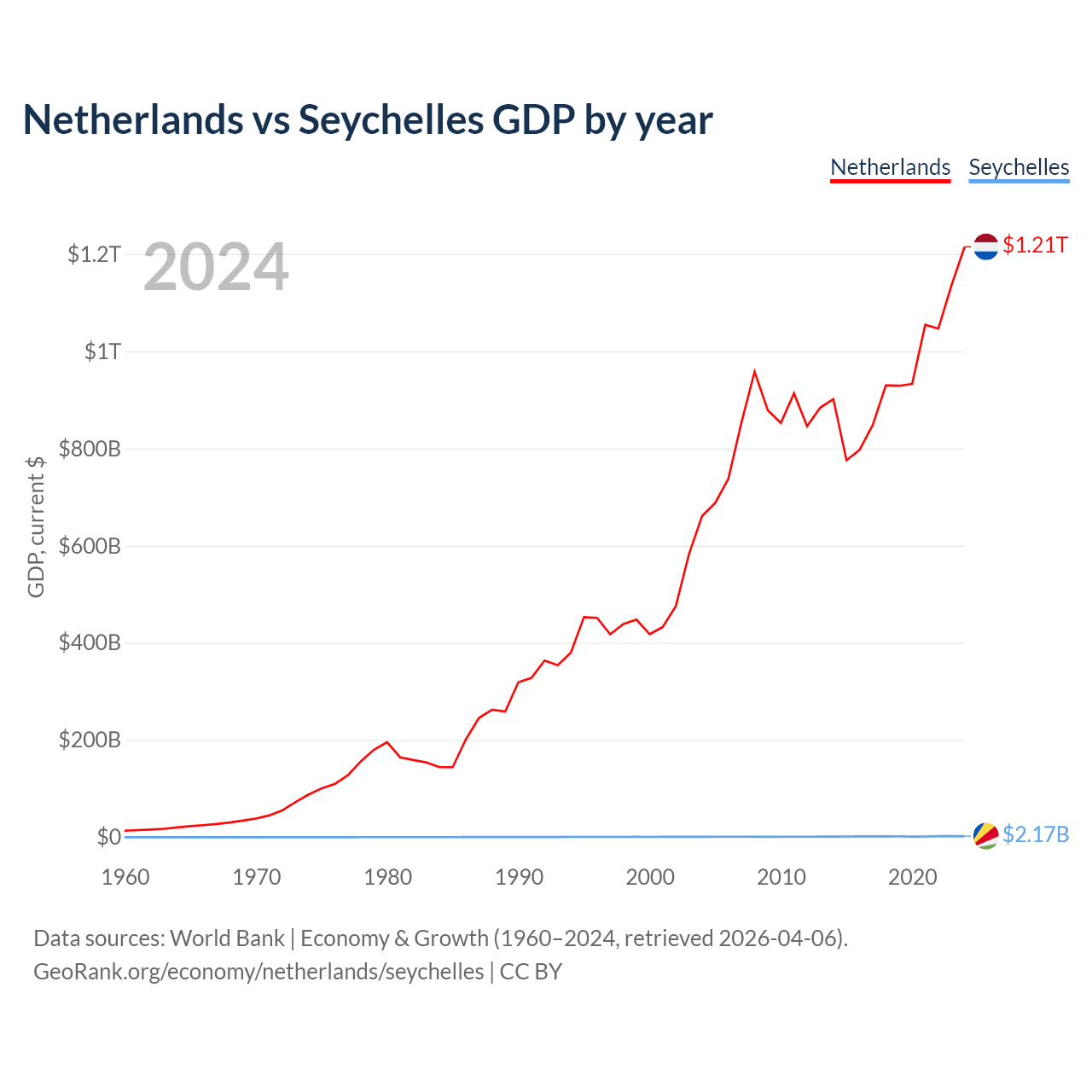 The Netherlands has a GDP of $1.21T compared to $2.17B for the Seychelles, ranking 19/197 and 178/197 by economy size, respectively.