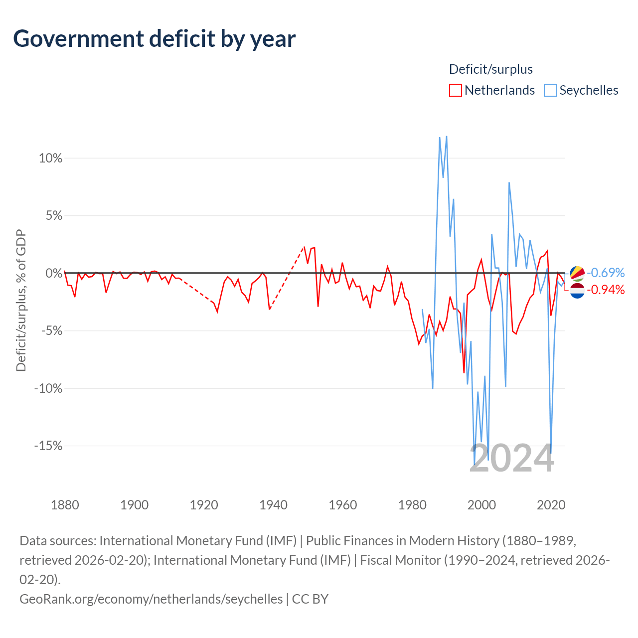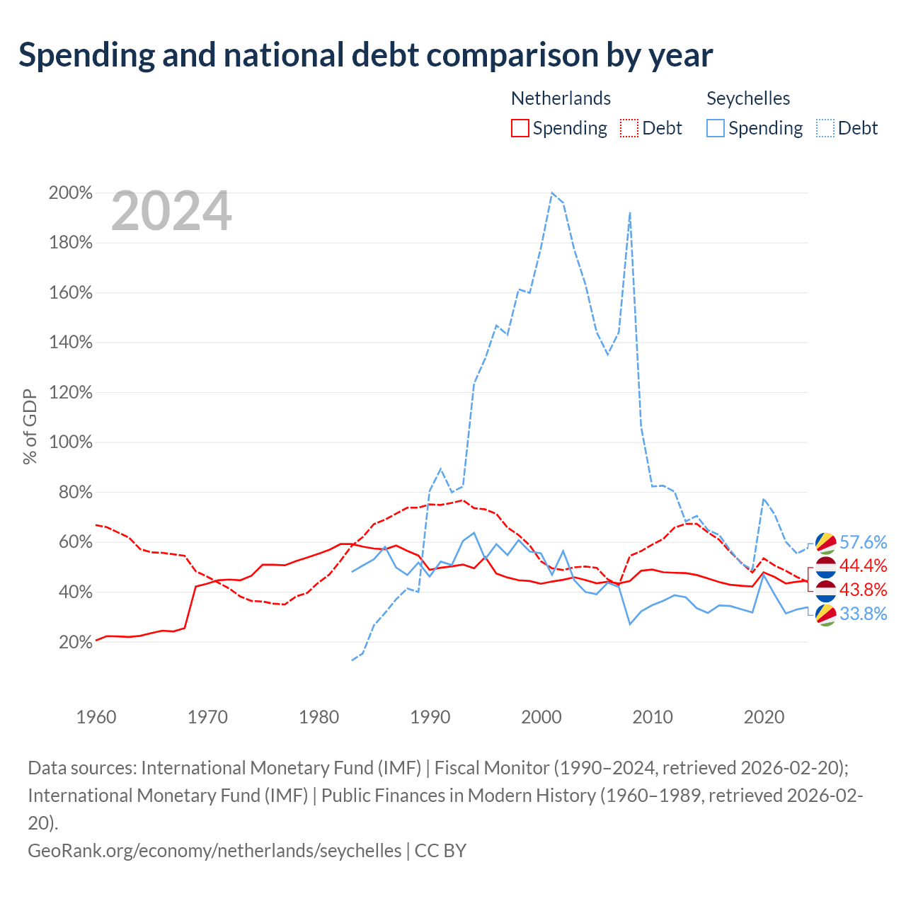 The Netherlands has $532B in government debt (43.8% of GDP), compared to $1.25B (57.6% of GDP) in the Seychelles.