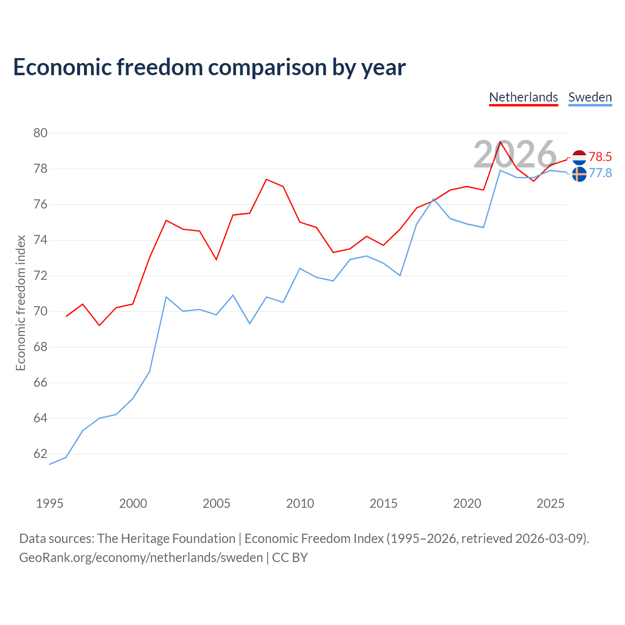 The Economic Freedom Index for the Netherlands is 78.5, ranking 11/197, compared to 77.8 for Sweden, ranking 14/197. The chart above displays a comparison of annual changes in economic freedom indexes.