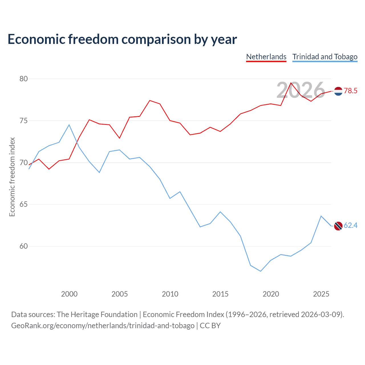 The Economic Freedom Index for the Netherlands is 78.5, ranking 11/197, compared to 62.4 for Trinidad and Tobago, ranking 87/197. The chart above displays a comparison of annual changes in economic freedom indexes.