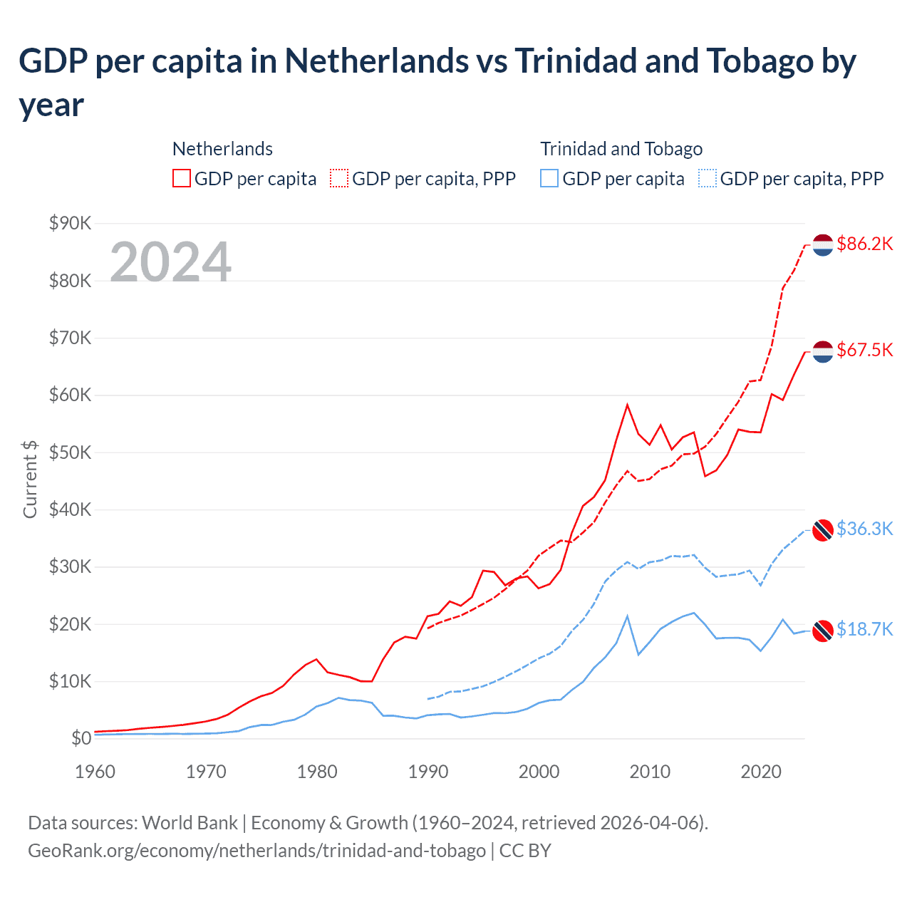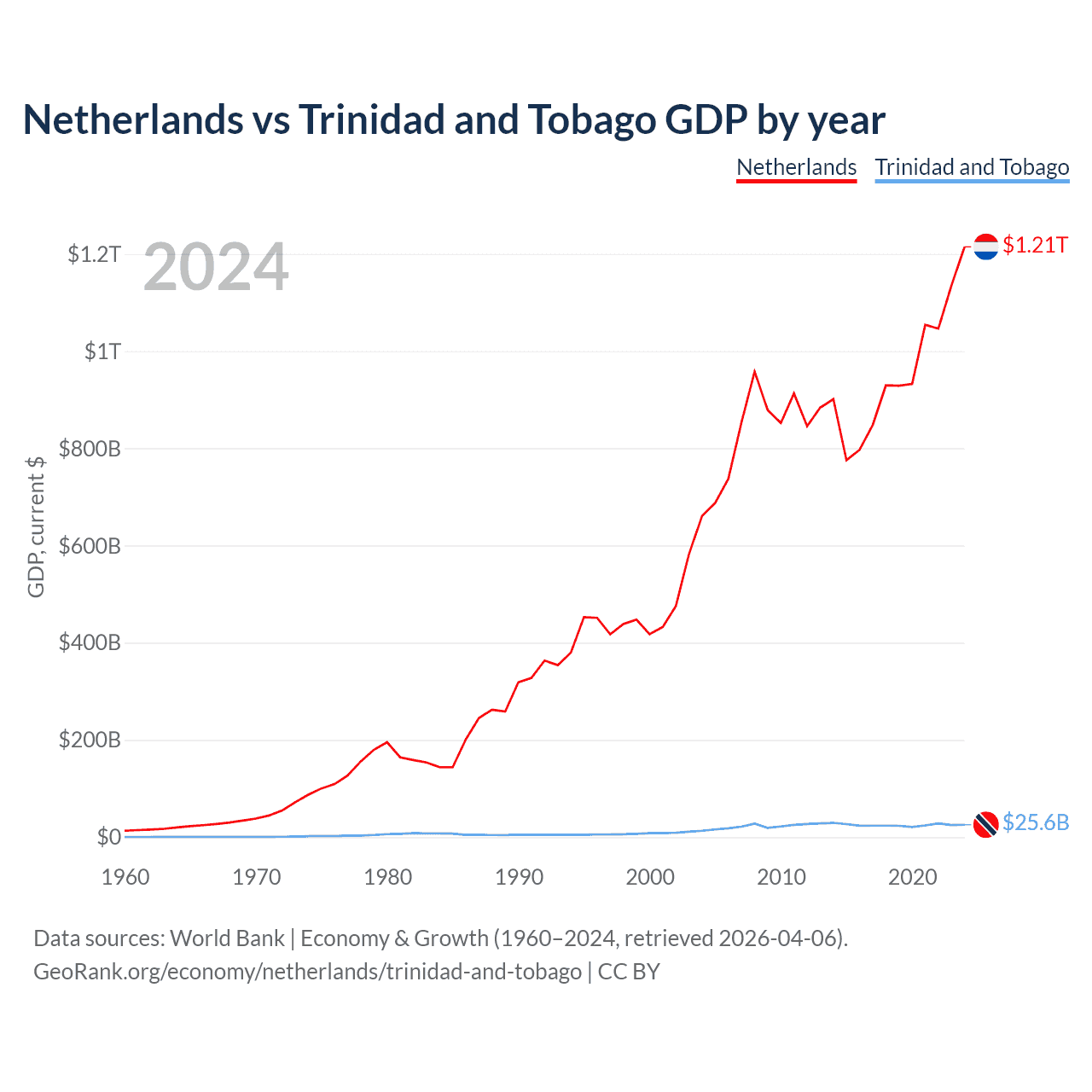 The Netherlands has a GDP of $1.21T compared to $25.6B for Trinidad and Tobago, ranking 19/197 and 115/197 by economy size, respectively.