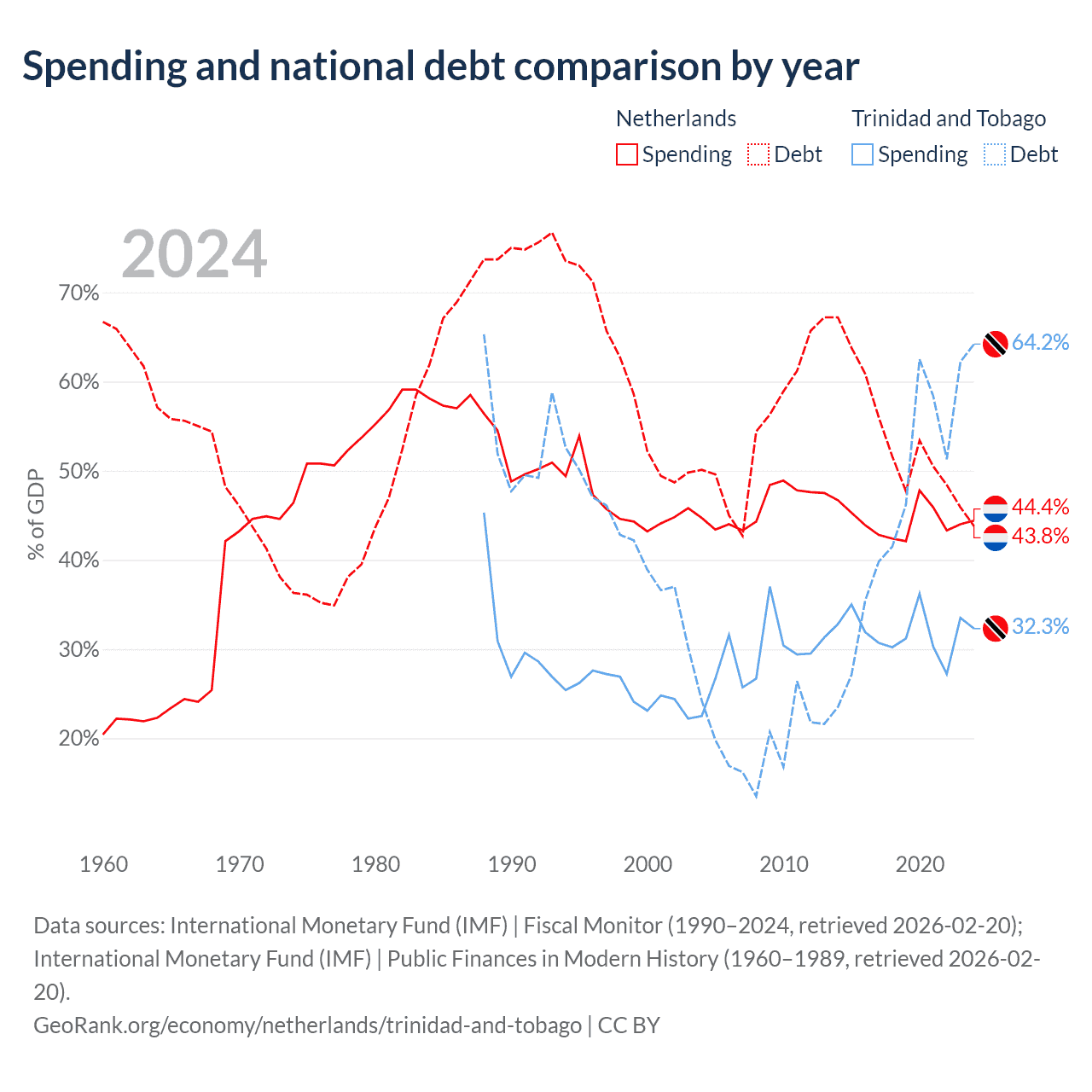 The Netherlands has $532B in government debt (43.8% of GDP), compared to $16.5B (64.2% of GDP) in Trinidad and Tobago.