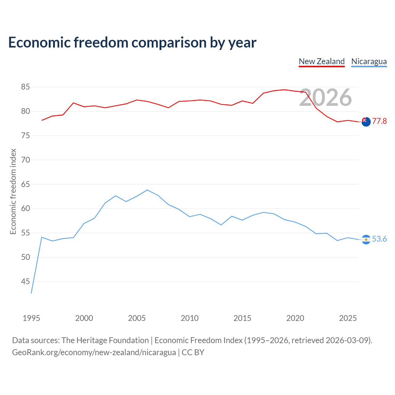 The Economic Freedom Index for New Zealand is 77.8, ranking 13/197, compared to 53.6 for Nicaragua, ranking 139/197. The chart above displays a comparison of annual changes in economic freedom indexes.