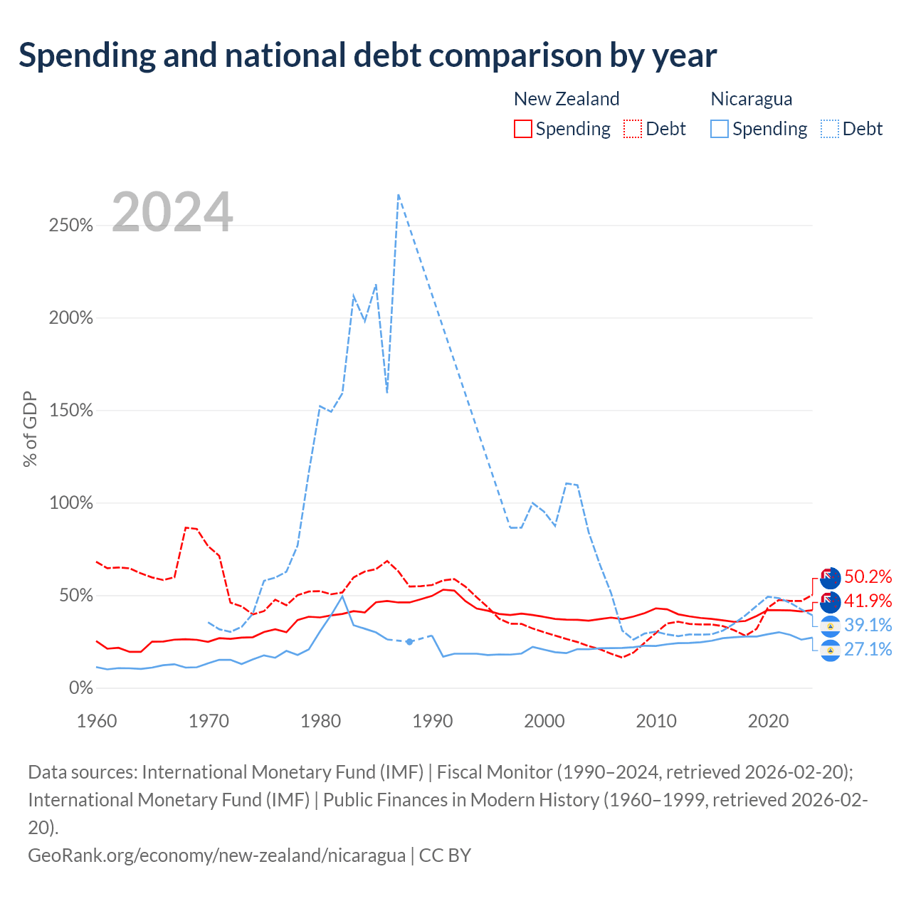 New Zealand has $131B in government debt (50.2% of GDP), compared to $7.71B (39.1% of GDP) in Nicaragua.