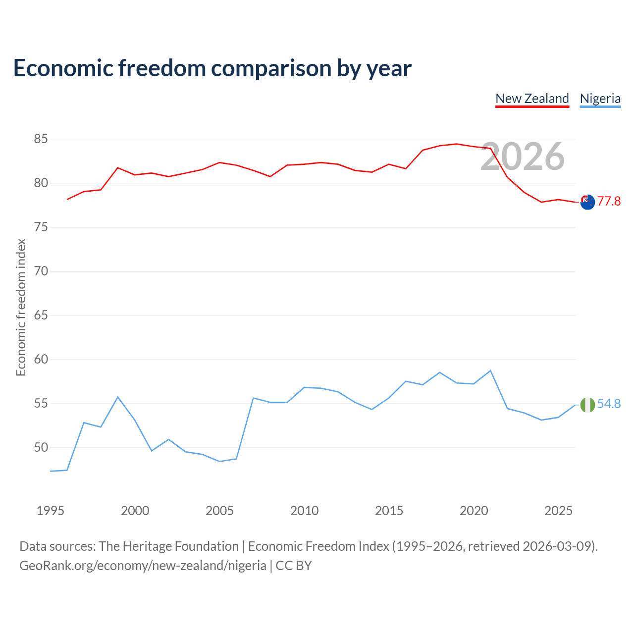 The Economic Freedom Index for New Zealand is 77.8, ranking 13/197, compared to 54.8 for Nigeria, ranking 132/197. The chart above displays a comparison of annual changes in economic freedom indexes.