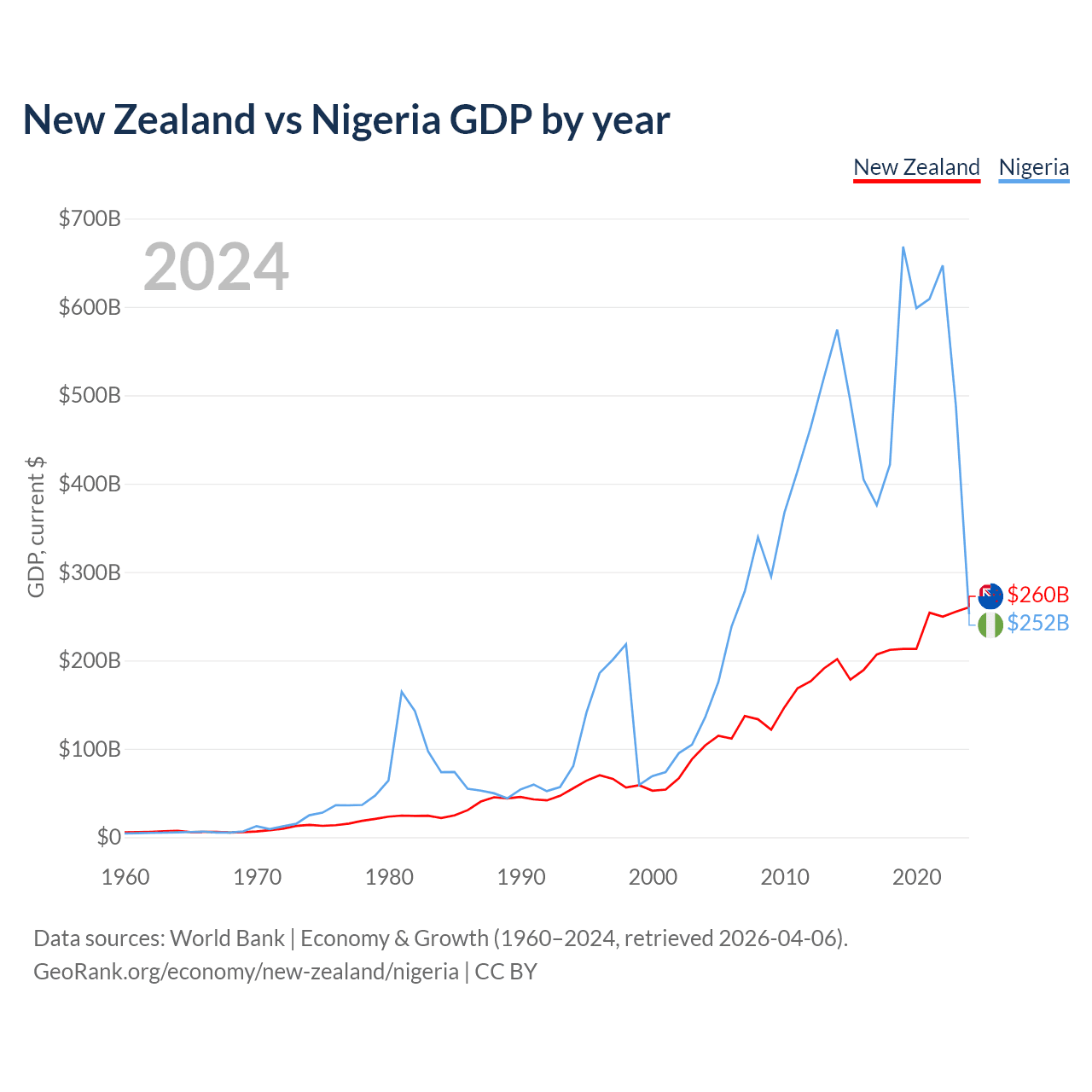 New Zealand has a GDP of $260B compared to $252B for Nigeria, ranking 52/197 and 54/197 by economy size, respectively.