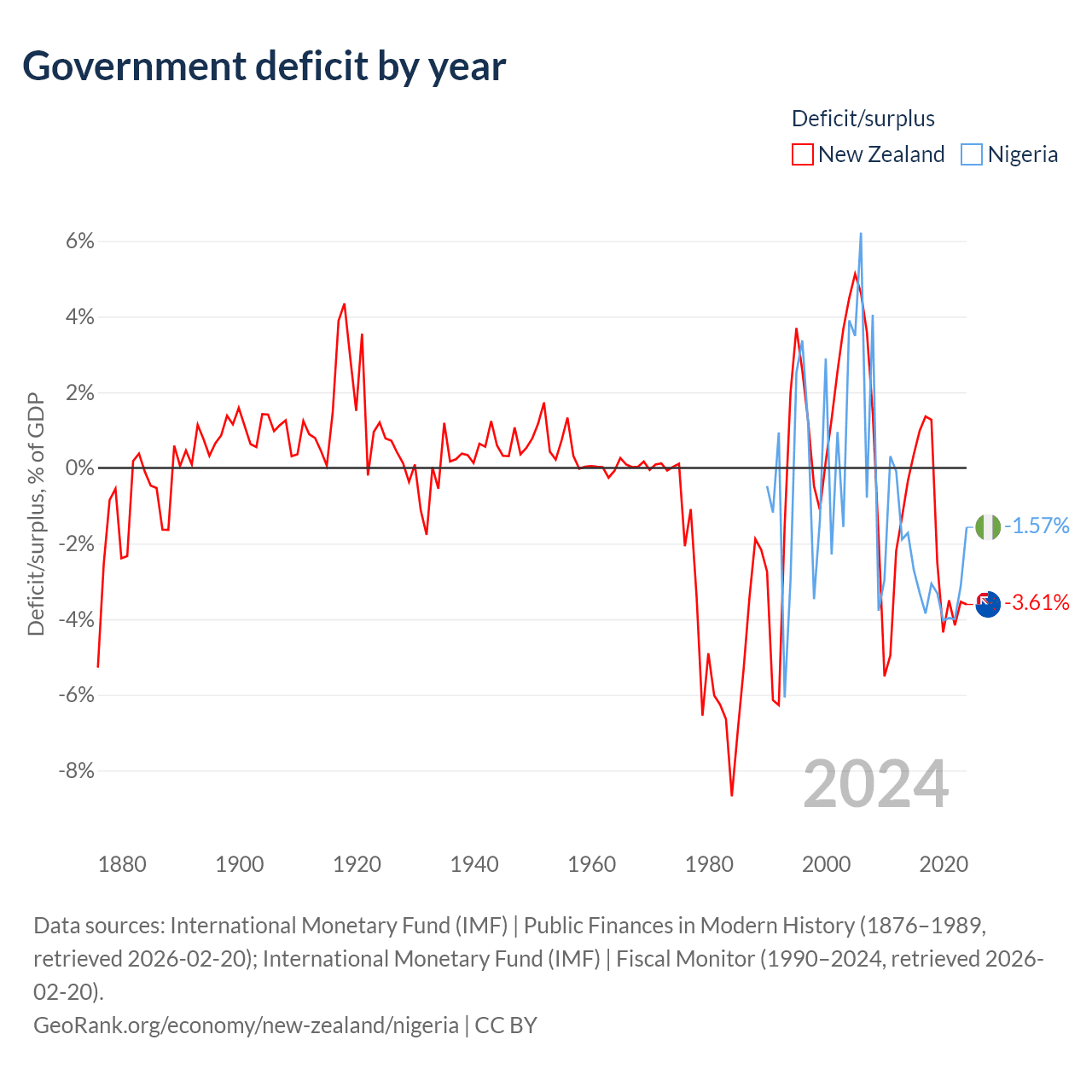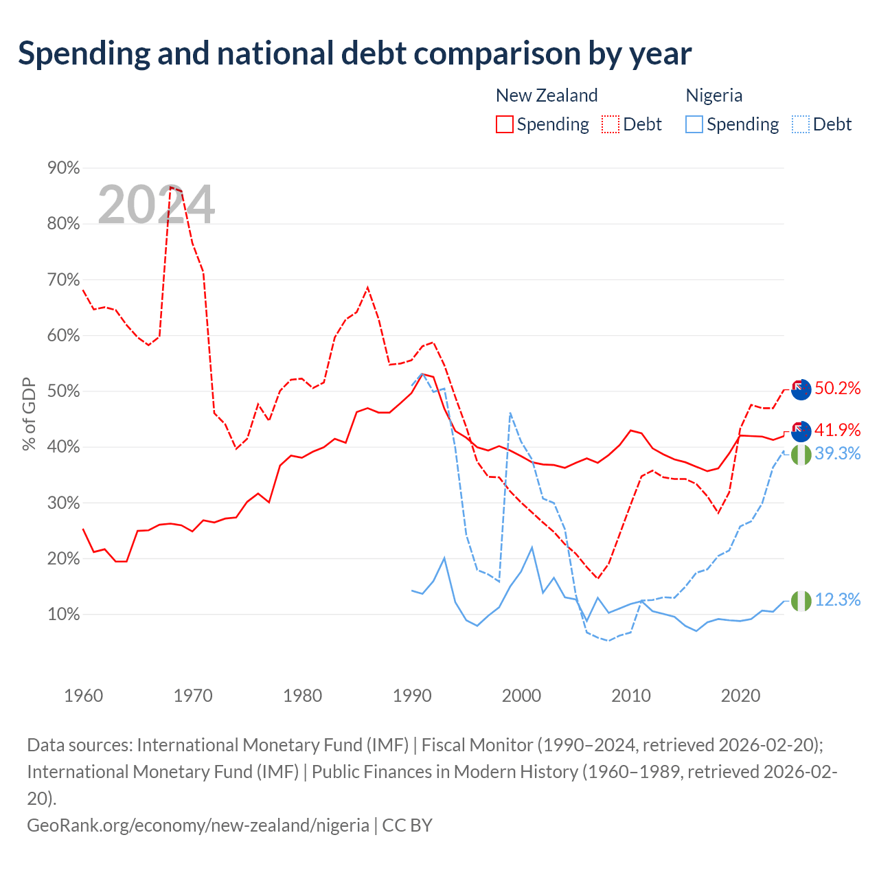 New Zealand has $131B in government debt (50.2% of GDP), compared to $99.2B (39.3% of GDP) in Nigeria.