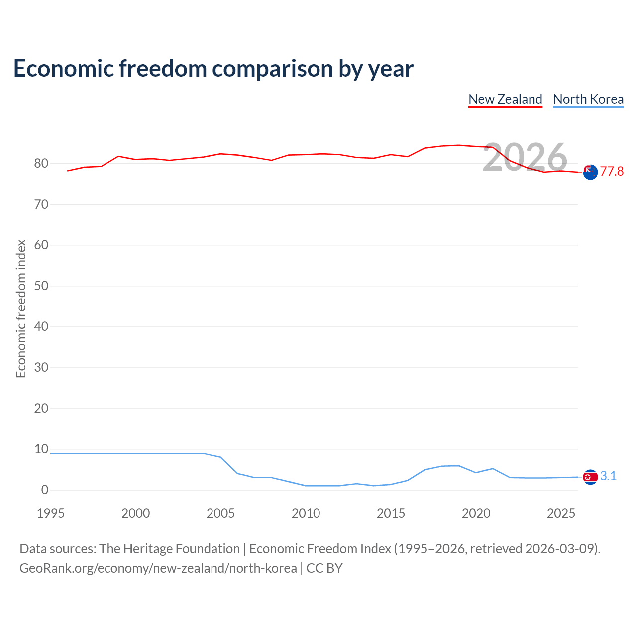 The Economic Freedom Index for New Zealand is 77.8, ranking 13/197, compared to 3.1 for North Korea, ranking 197/197. The chart above displays a comparison of annual changes in economic freedom indexes.