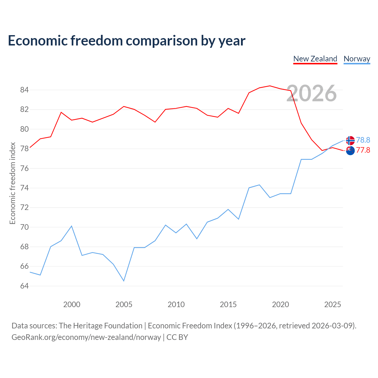The Economic Freedom Index for New Zealand is 77.8, ranking 13/197, compared to 78.8 for Norway, ranking 9/197. The chart above displays a comparison of annual changes in economic freedom indexes.